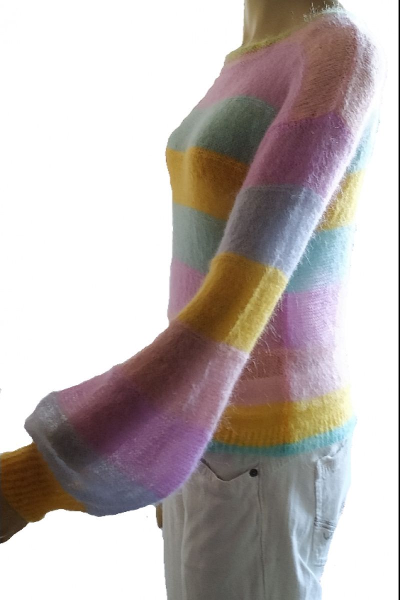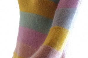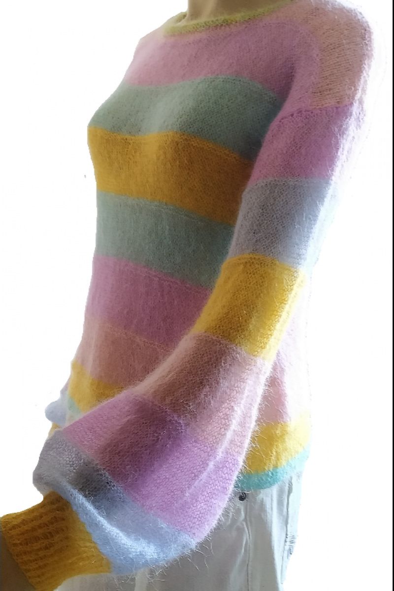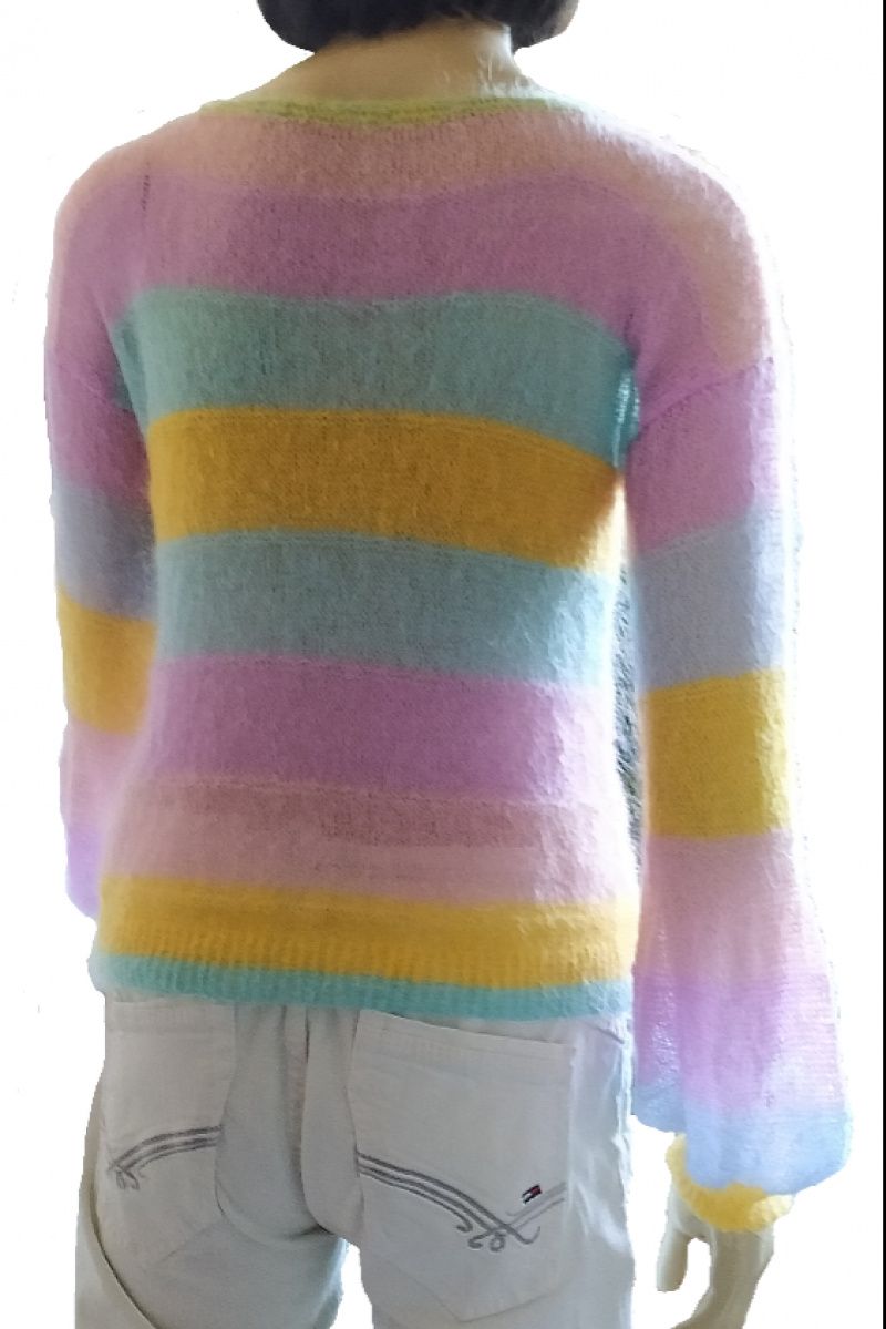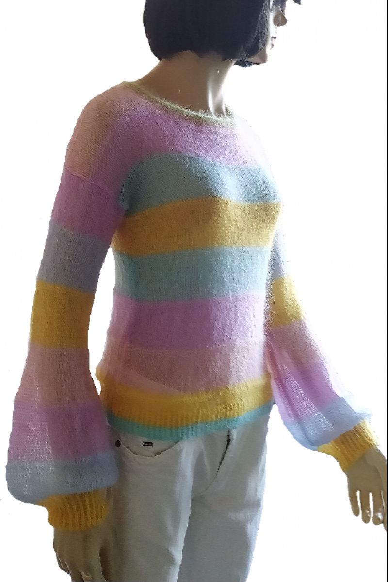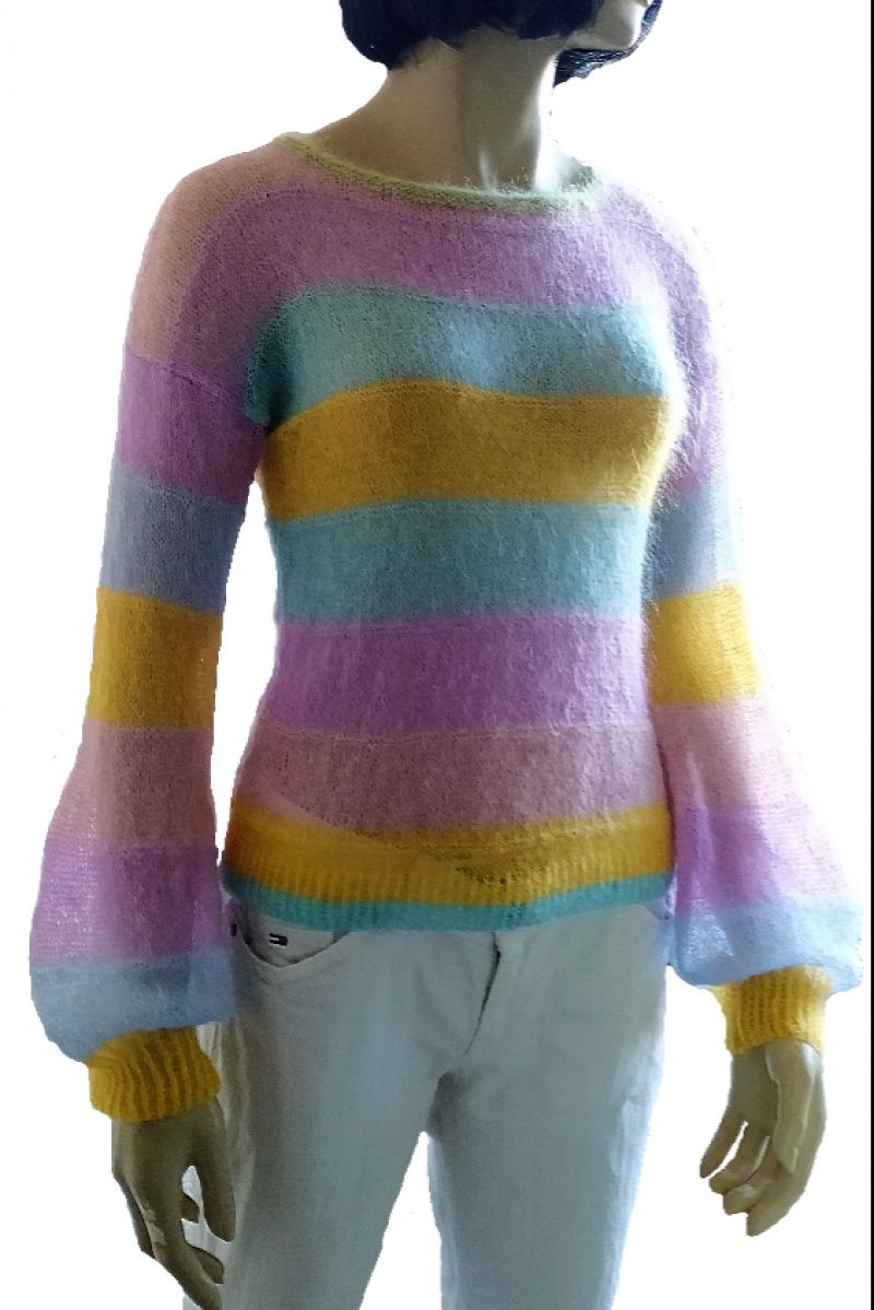 Яскравий стильний светр-райдуга з найтоншого мохера. Невагомий легкий із широким пишним рукавом. Прозорий та повітряний. Легкий, як хмарка. Відмінно поєднується з будь-яким низом. Ошатний повсякденний светр. Підходить для розмірів 42-46. Зростання манекена 1 метр 75 сантиметрів. Довжина 52 сантиметри Ширина у вільному стані 43 сантиметри Плечо 17 сантиметрів Пройма 21 сантиметр Рукав від плечового шва 53 сантиметри Виріз горловини 28 сантиметрів Прати виключно вручну при температурі не вище 30 градусів з додаванням миючого засобу, що не містить хлору. Ви можете додати кондиціонер для білизни. Замочіть виріб на 10 хвилин, а потім змийте чистою водою. Злегка відіжміть долонями і розподіліть по гладкій поверхні на рушник до повного висихання.
