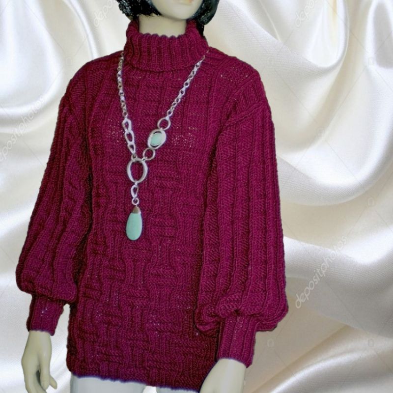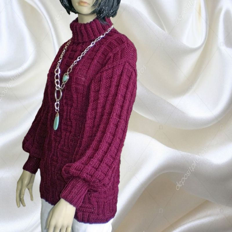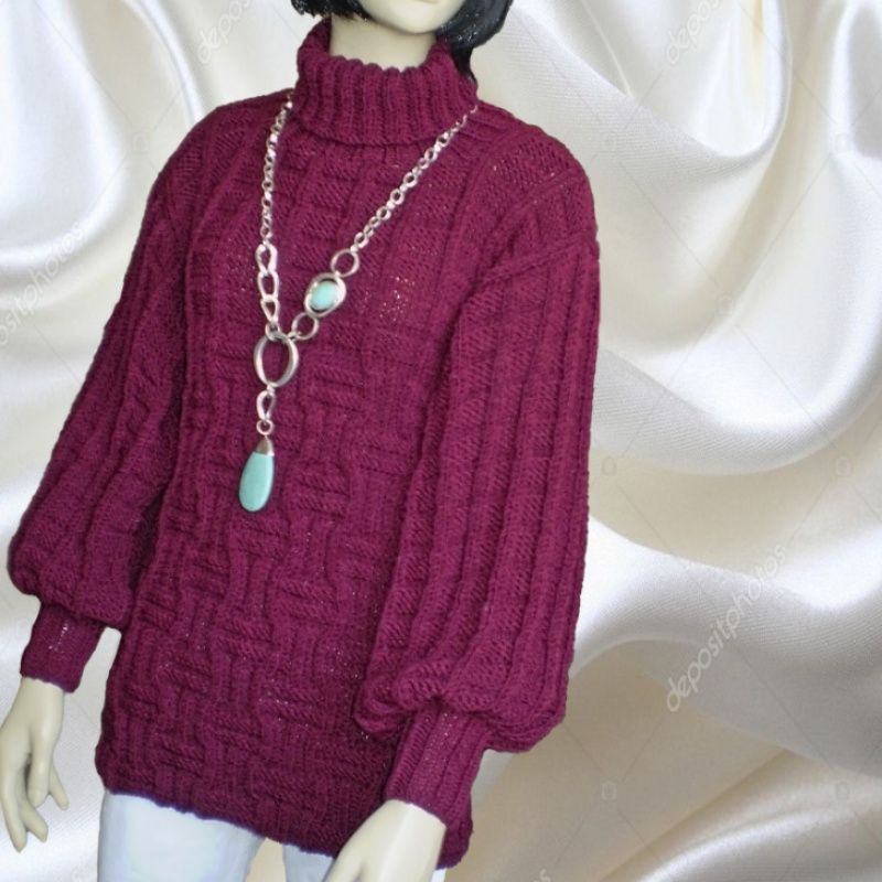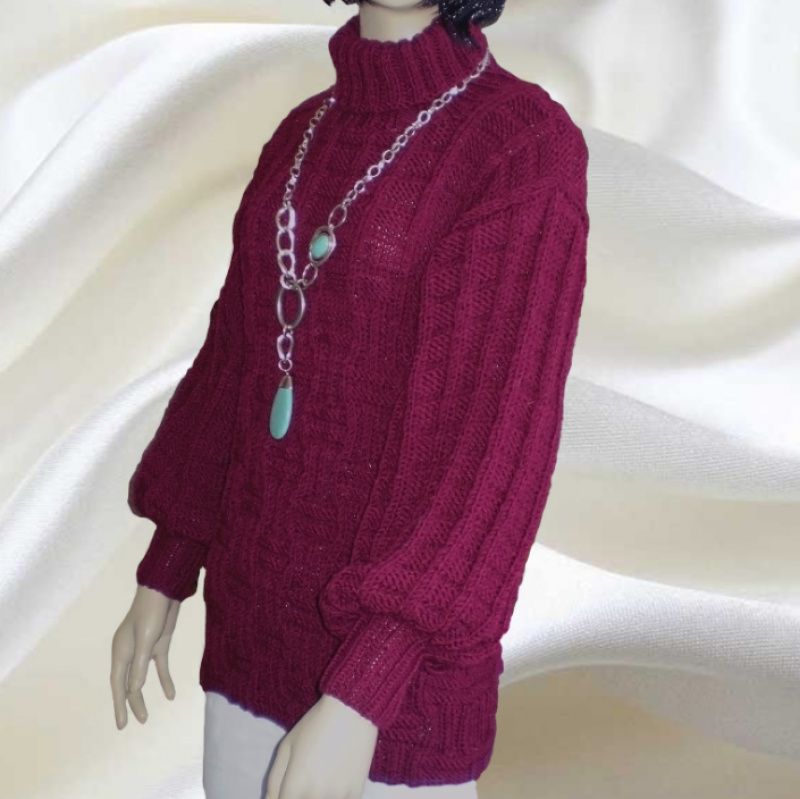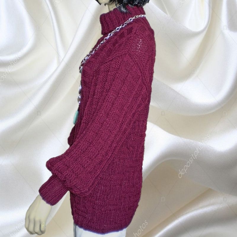 Жіночий светр оверсайз грубої в'язки з товстої пряжі напіввовна, глибокого насиченого темного кольору марсала. Широкий рукав на резинці і високий воріт. Ефектний рельєфний структурний візерунок. М'який, теплий і стильний Розмір 44-48 Зростання манекена 1,75