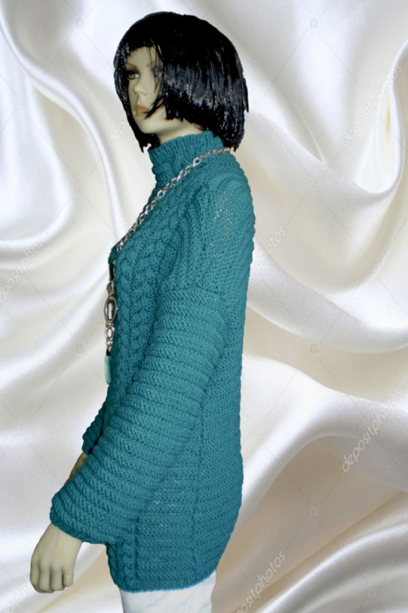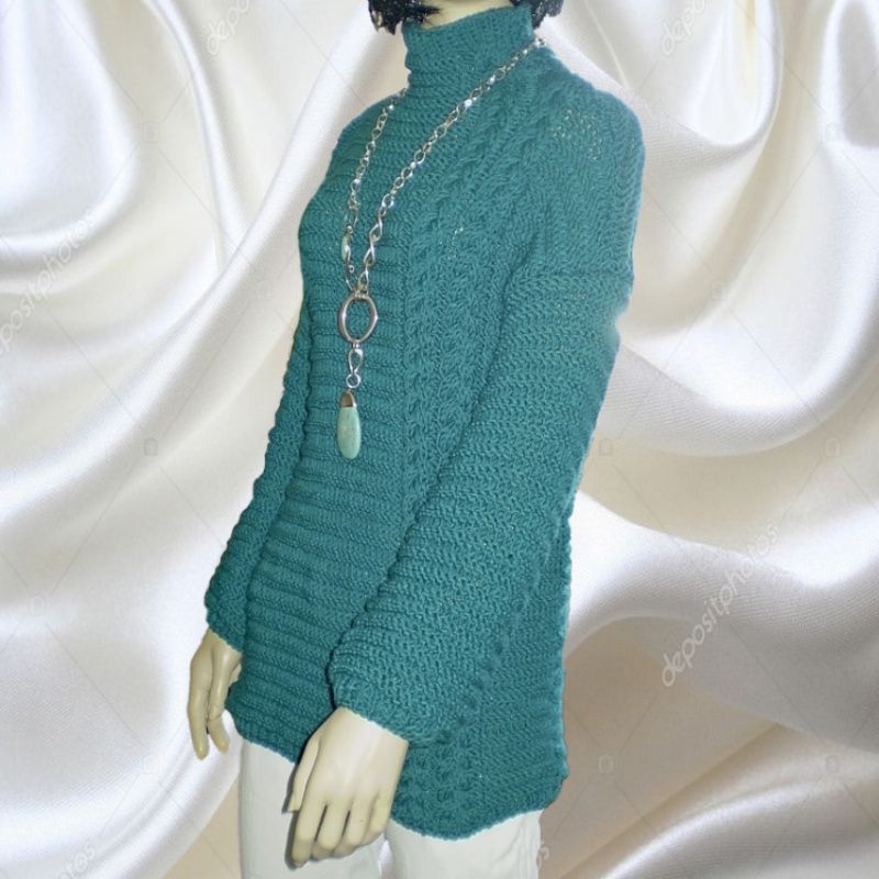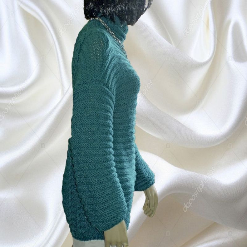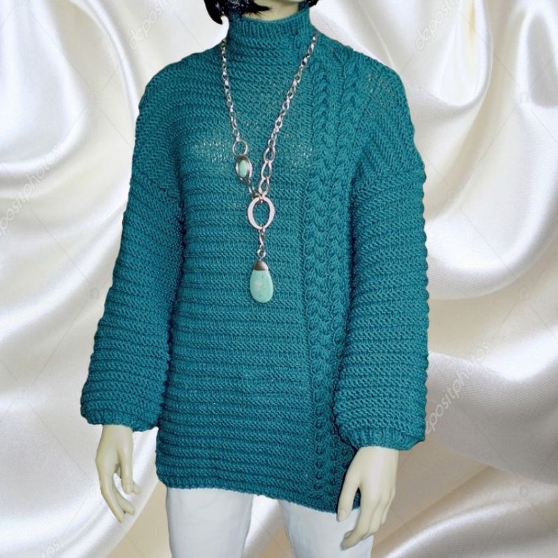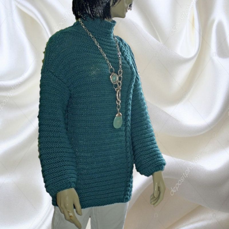 Жіночий зимовий светр-оверсайз грубої в'язки з заниженою проймою і високим коміром. Вільний рукав на планці. асиметричний візерунок коса. Гарний колір темний смарагд і товста пряжа напіввовна. Розмір 42-46. Теплий, м'який, стильний Зростання манекена 1,75