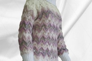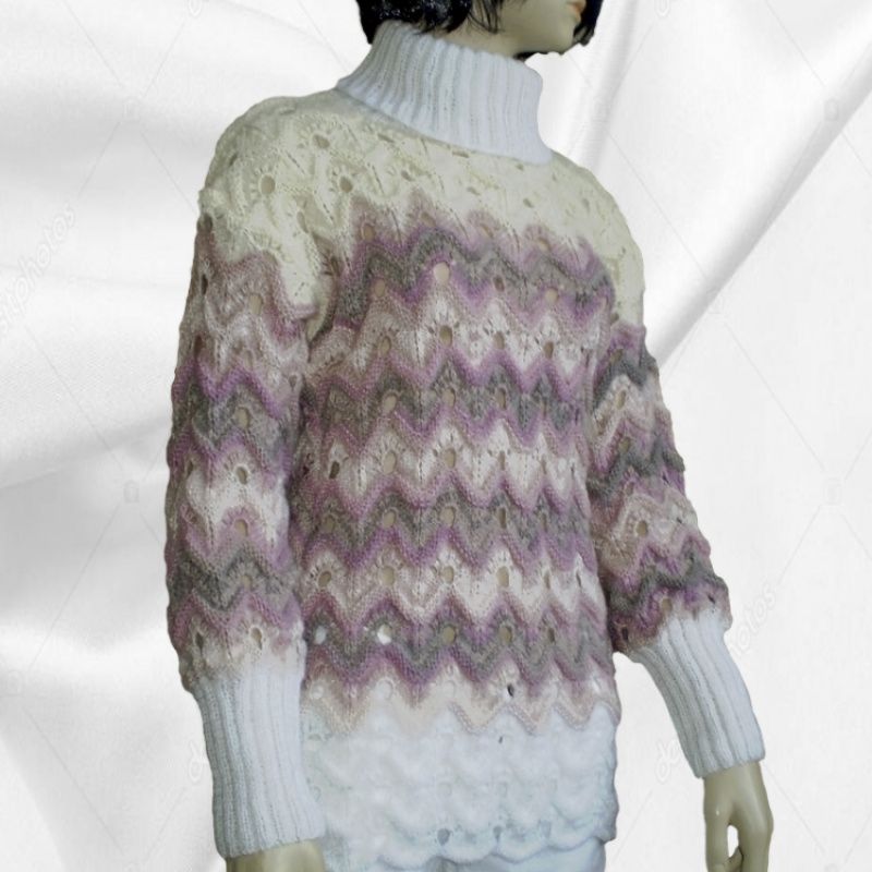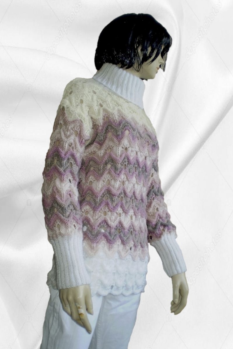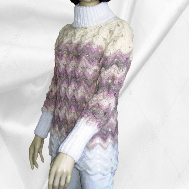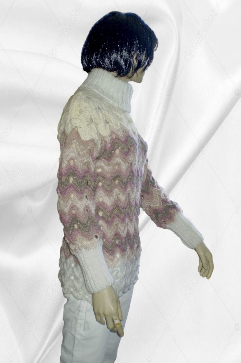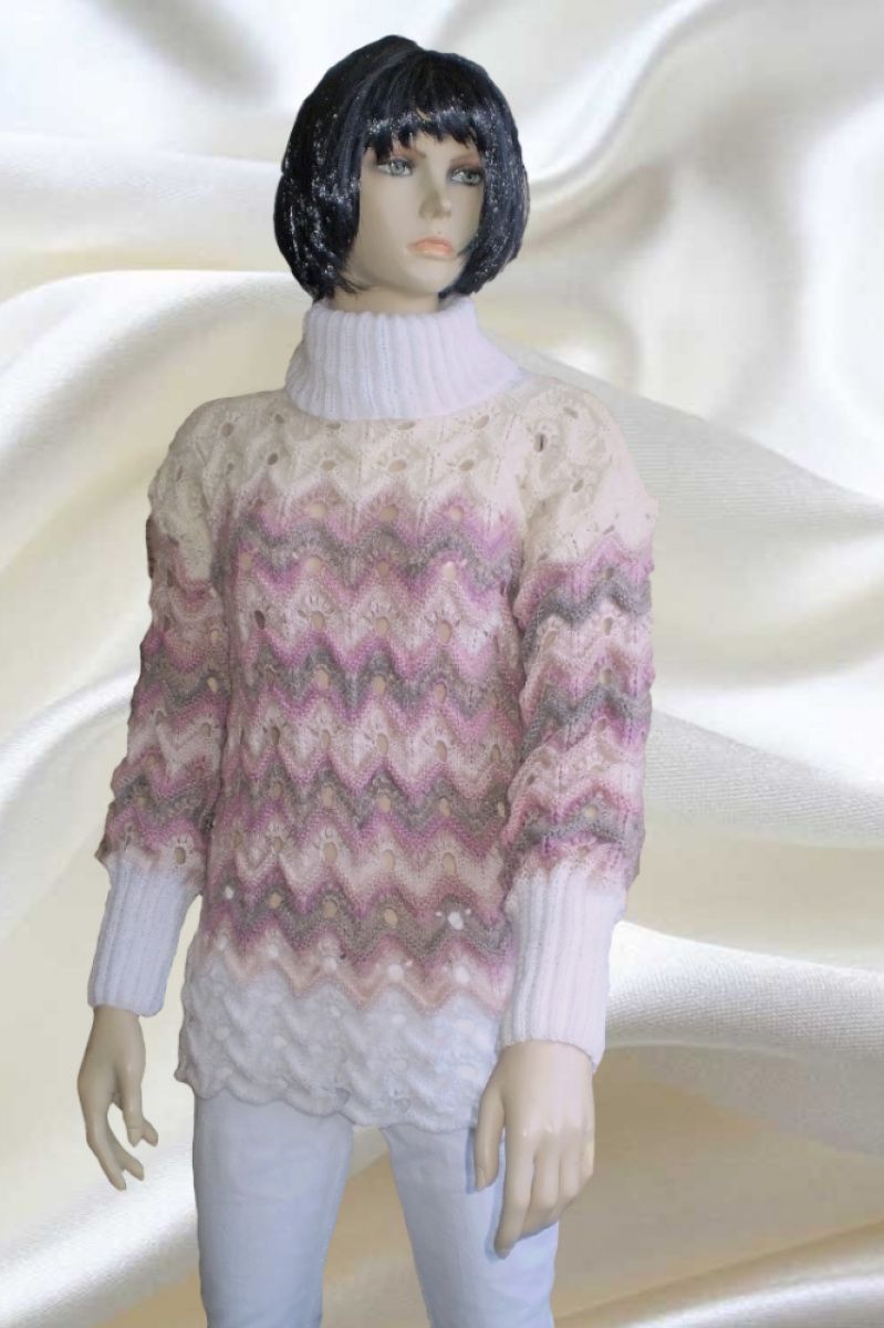 Жіночий об'ємний зимовий светр-Міссоні з високим коміром. Гарний незвичайний ажурний візерунок-Міссоні і і м'які пастельні тони. Пряжа- ангора + кідмохер. М'який, теплий, легкий по вазі. Вільний, грубої в'язки. Зростання манекена 1,75 Прати вручну при температурі не вище 45 градусів. Злегка віджати, дати воді стекти і розкласти на гладкій поверхні до повного висихання.