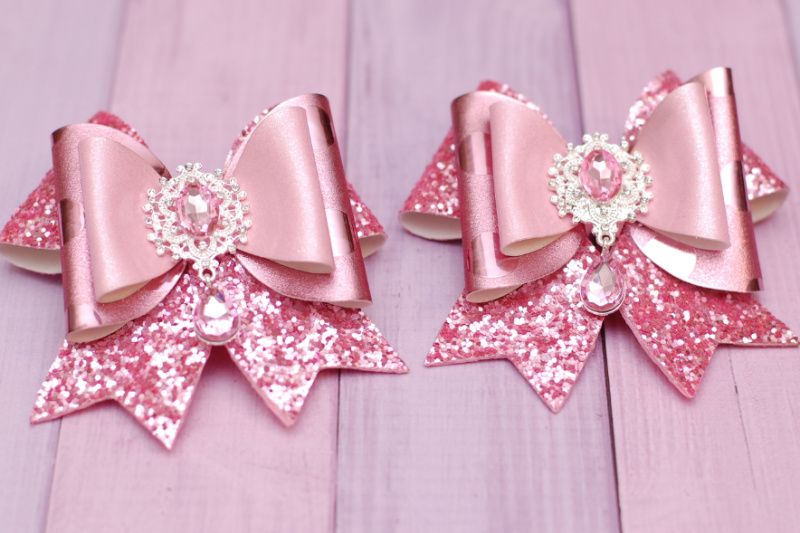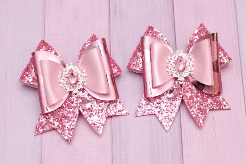 Модні бантики виконані з блискучою екокожі, красиво переливаються. Декоровані красивою стразового серединкою. Основа - гумки.