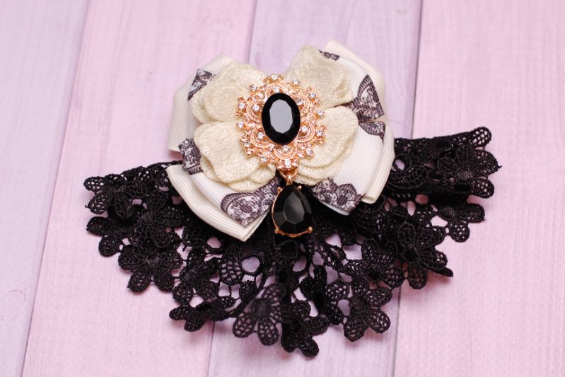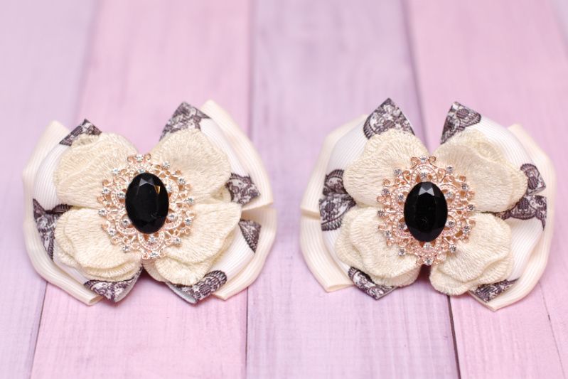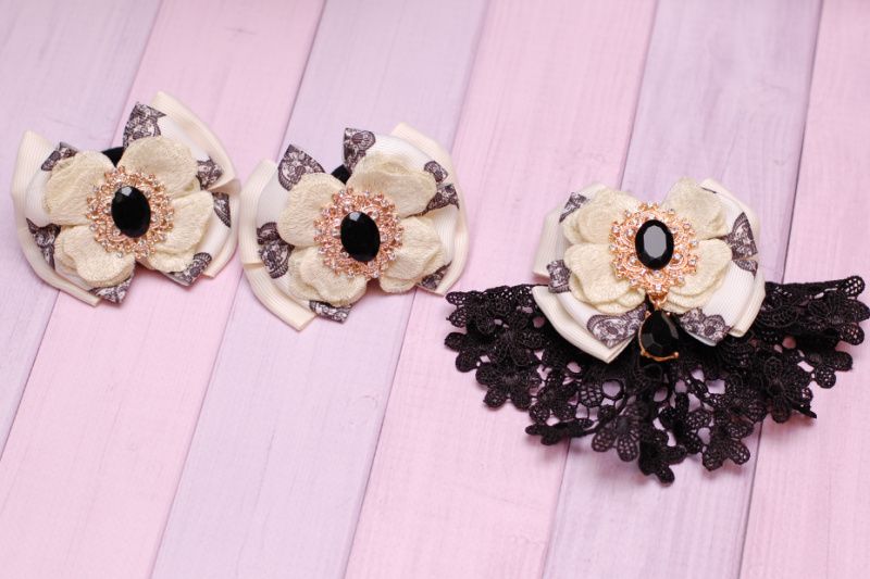 Ошатний комплект складається з бантів (основа - гумки) і краватки. Виконано в бежево-чорному кольорі з якісних репсових стрічок, декорований красивою стразового серединкою. Виглядає дуже ефектно, підійде як першокласникам, так і дівчаткам постарше. Розміри бантиків 8 * 7 см Краватка - 14 * 11 см