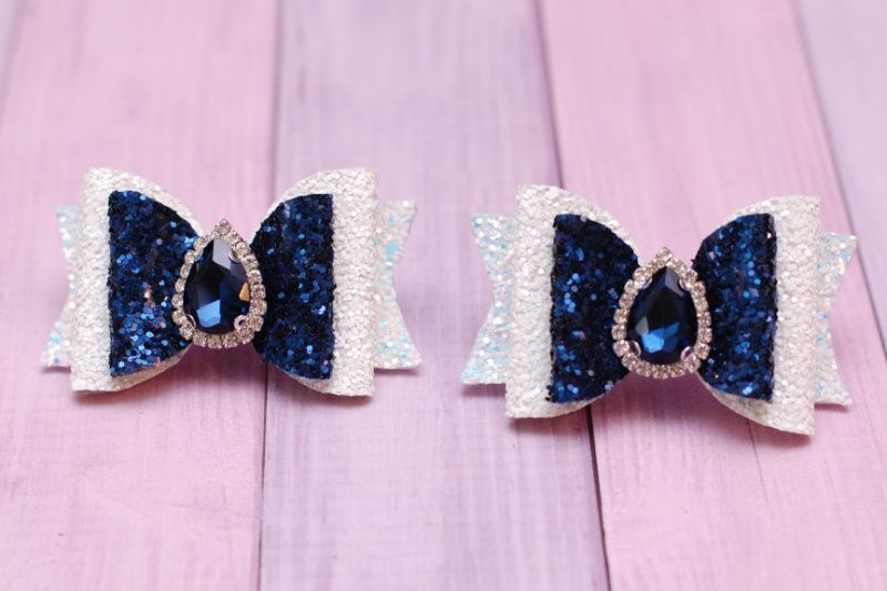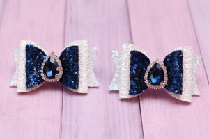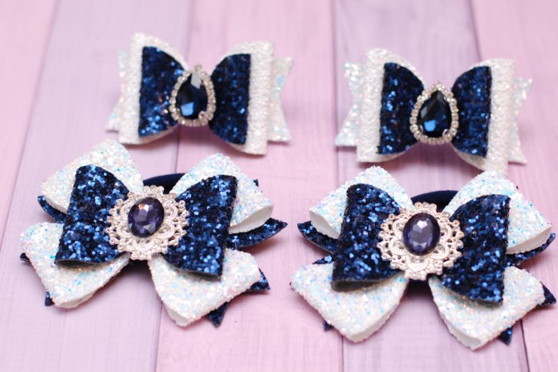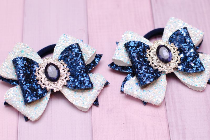 Модні бантики виконані з блискучої екошкіри, гарно переливаються. Декоровані красивою стразовою серединкою. Основа – гумки. Розміри великих бантиків 9*7,5 см, маленьких – 7*4 см.