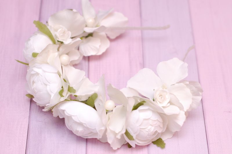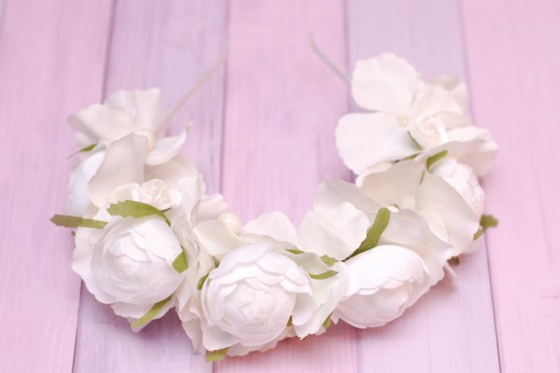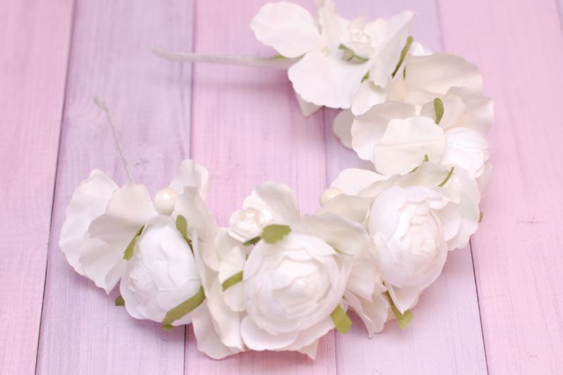 Обруч з півоніями і гортензією виконаний в білому кольорі. Квіточки тканевие.Об'емний, але легкий. Основа - обруч-металл.Подойдет для нареченої, дівич-вечора і фотосесії.