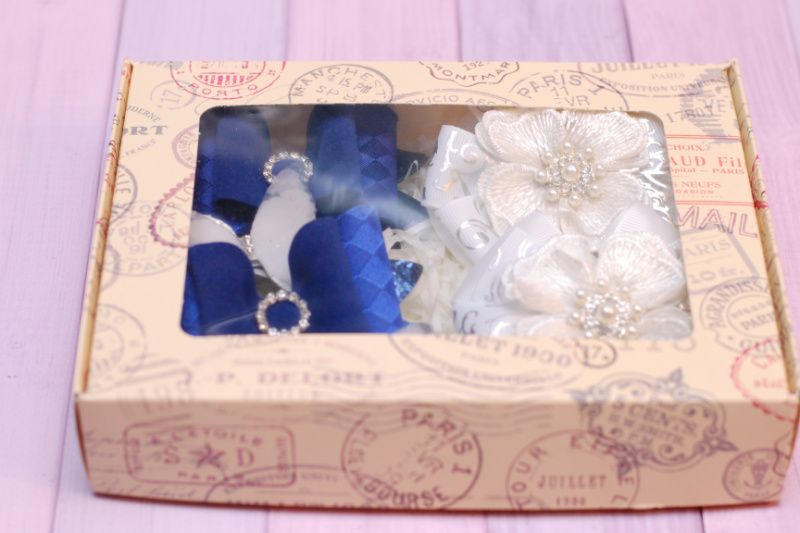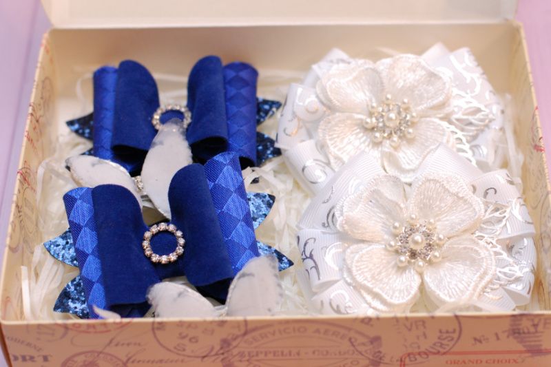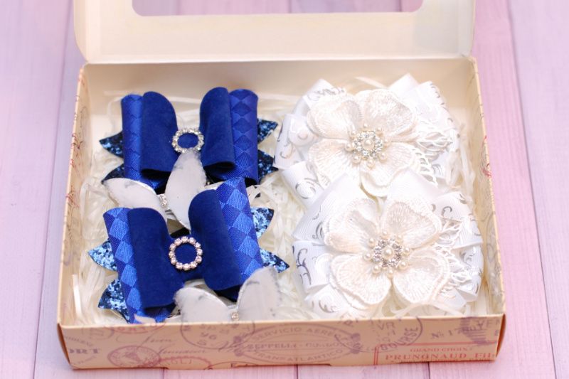 Набір виконаний в біло-синьому кольорі і складається з: 1 гумки з бантами з екошкіри розміром 8,5*5,5 см 2 гумки з тканинними бантами розміром 9*7 см 3 шпильки з метеликами шифоновими розміром 5*3,5 см Набір упакований у святковій коробці. Розміри коробочки 20*15*4 см