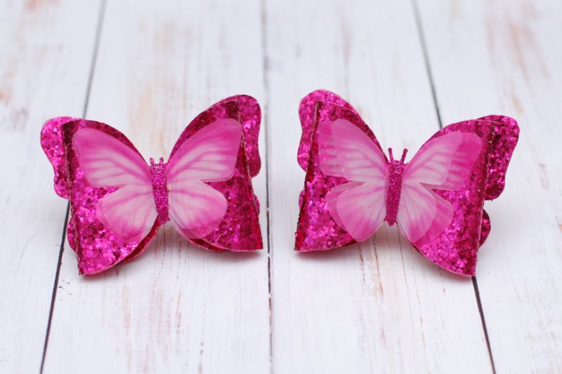 Бантики виконані з екокожі в малиновому кольорі. Декоровані шифоновими метеликами. Розміри бантика 8 * 6 см. Основа- гумки