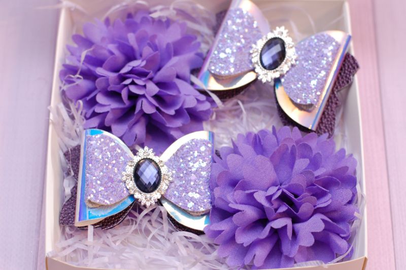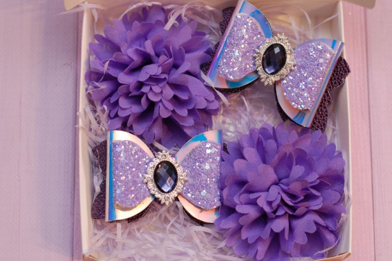 Набір виконаний у фіолетовому кольорі та складається з: 1 гумки з бантами з екошкіри розміром 8,5*5,5 см 2 гумки з тканинними кольорами діаметром 9 см Набір упакований у святкову коробку. Розміри коробочки 15*15*3 см
