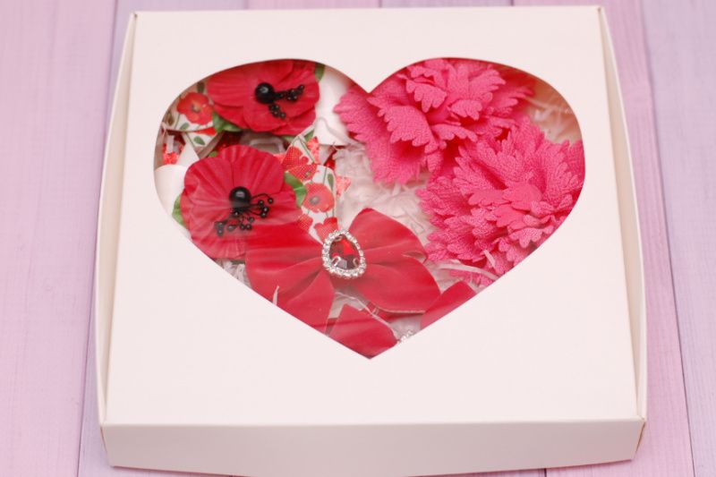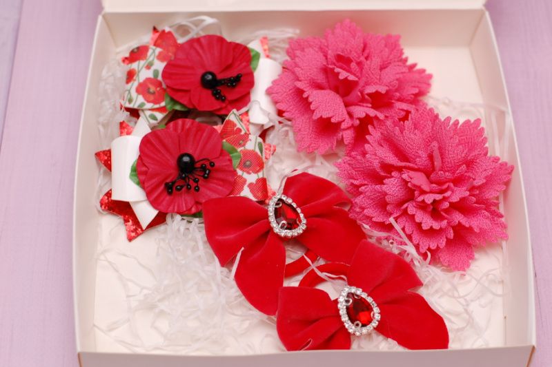 Набір виконаний в червоно-кораловому кольорі і складається з: 1 - резиночки з бантиками з екокожі розміром 9 * 6,5 см декоровані маками ручної роботи. 2 - гумки з тканинними квітами в кораловому кольорі діаметром 9 см. 3 - гумки з бантиками з оксамиту в червоному кольорі декоровані стразового серединкою. Розміри бантика 7 * 7 см Набір упакований в святкову коробку. Розміри коробочки 23 * 23 * 3 см