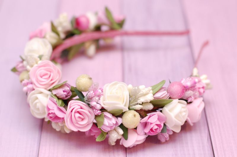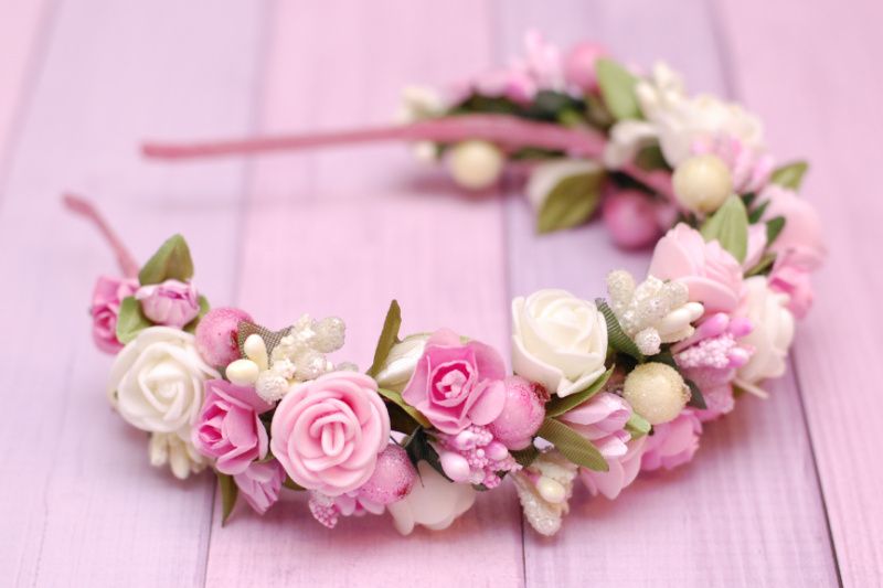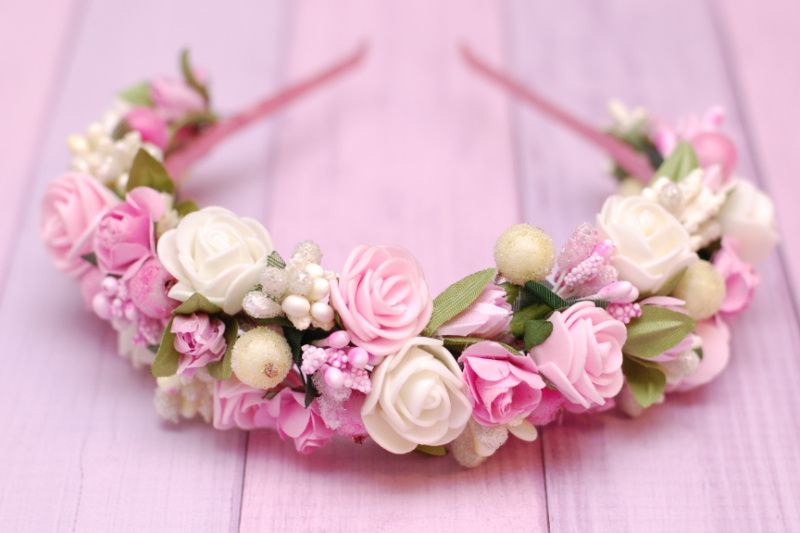Ободок виконаний на металевій основі в кремово-рожевих тонах. Дуже ніжний, підійде під будь-який наряд. Доповнить образ як для фотосесії, торжества, так і для повсякденного носіння.