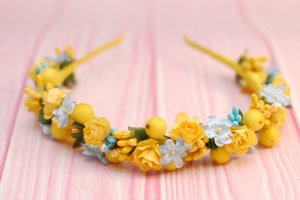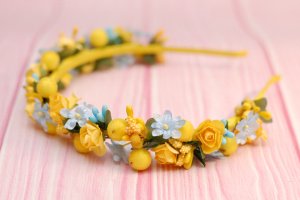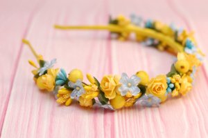 Ніжний обруч для волосся з маленькими квітами виконаний у жовто-блакитних кольорах . Підійде як для маленької принцеси, так і дорослої дівчини