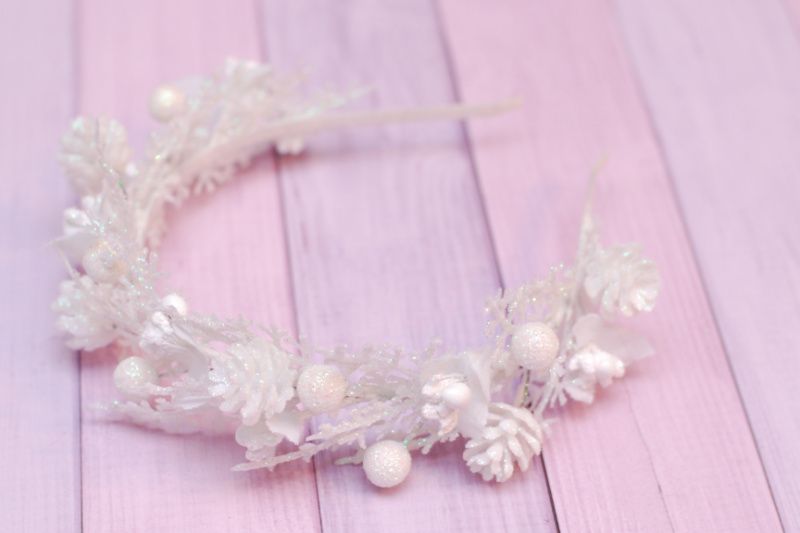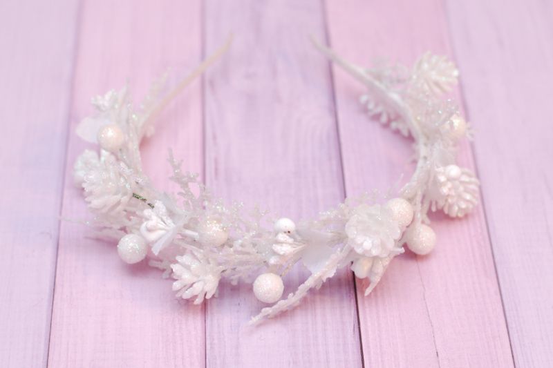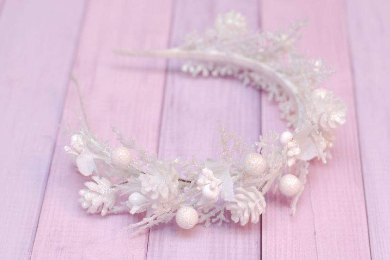 Обідок виконаний на металевій основі у білому кольорі. Декорований гілочками, ягідками та шишками. По-справжньому зимовий. Підійде для красивих зимових фотосесій, на ранки під образ завірюхи чи хуртовини