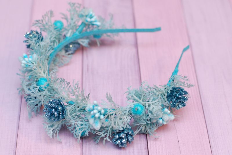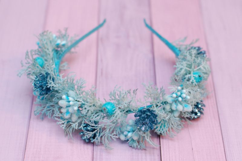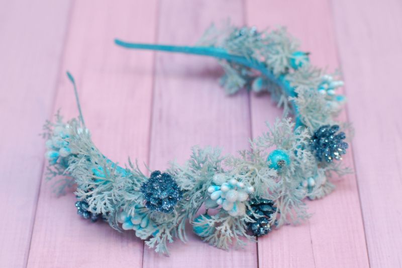 Обідок виконаний на металевій основі у бірюзовому кольорі. Декорований гілочками, ягідками, тичинками та шишками. Підійде для чудових зимових фотосесій, на ранки.