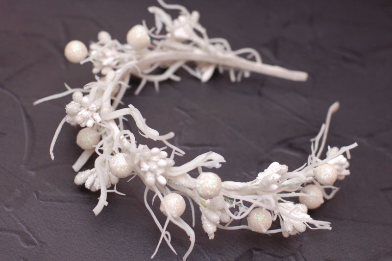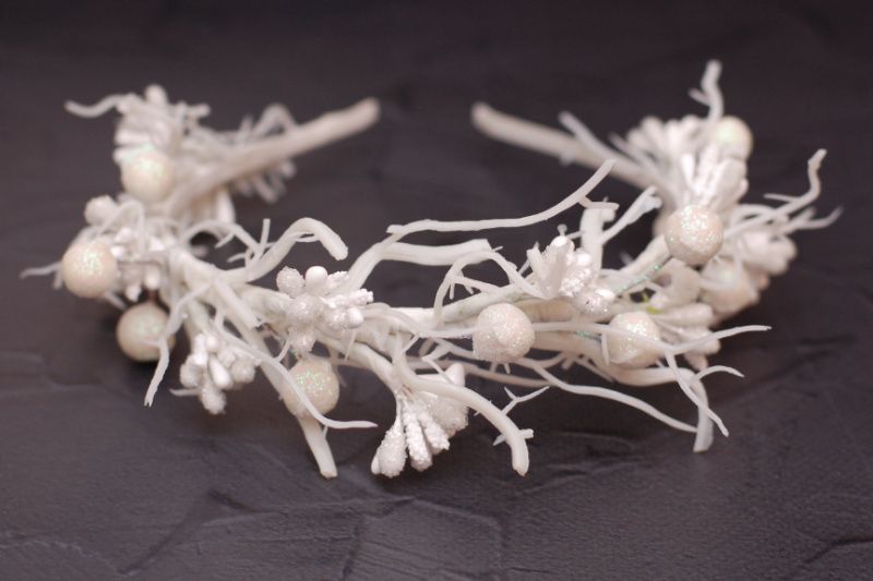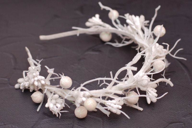Обідок виконаний на металевій основі у білому кольорі. Декорований гілочками, ягідками та тичинками. По-справжньому зимовий. Підійде для красивих зимових фотосесій, на ранки під образ завірюхи чи хуртовини