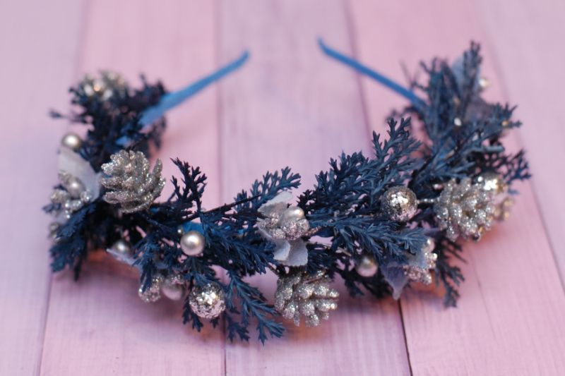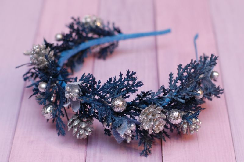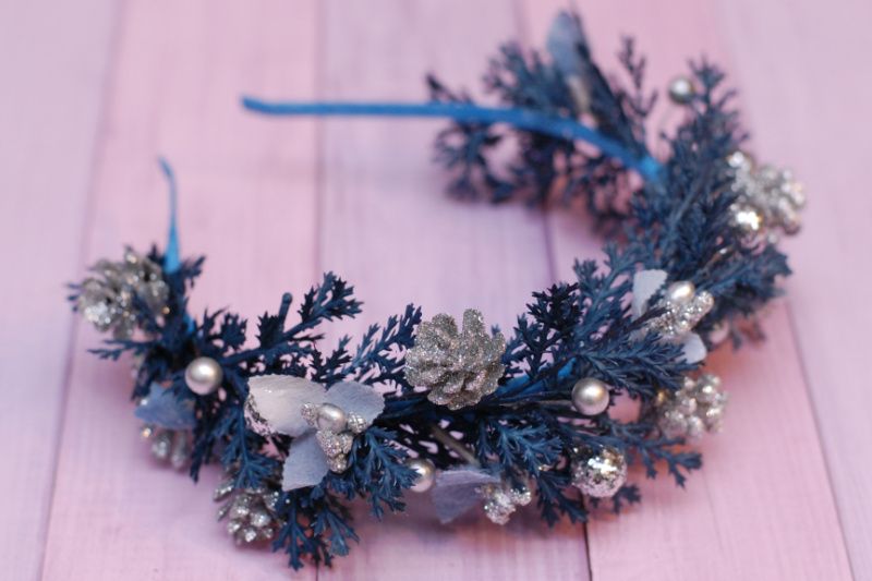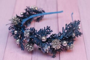 Обідок виконаний на металевій основі в синьо-сріблястому кольорі. Декорований гілочками, ягідками, тичинками та шишками. Підійде для чудових зимових фотосесій, на ранки.