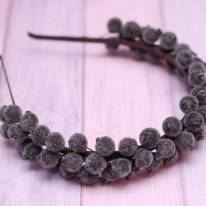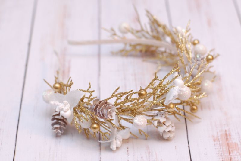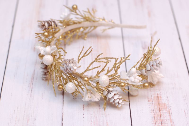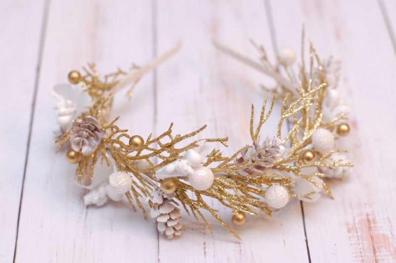 Обідок виконаний на металевій основі у біло-золотому кольорі. Декорований гілочками, ягідками та маленькими шишечками. По-справжньому зимовий. Підійде для красивих зимових фотосесій, на ранки під образ сніжинки чи хуртовини
