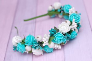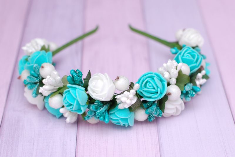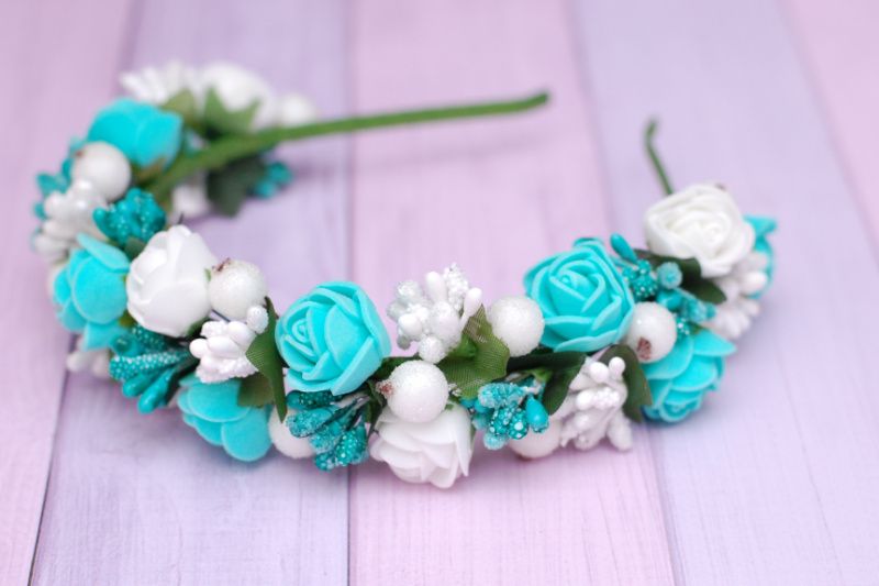 Обідок виконаний на металевій основі в білих і м'ятних тонах, дуже соковитий і яскравий, підійде як для фотосесії, свята, так і для повсякденного носіння.