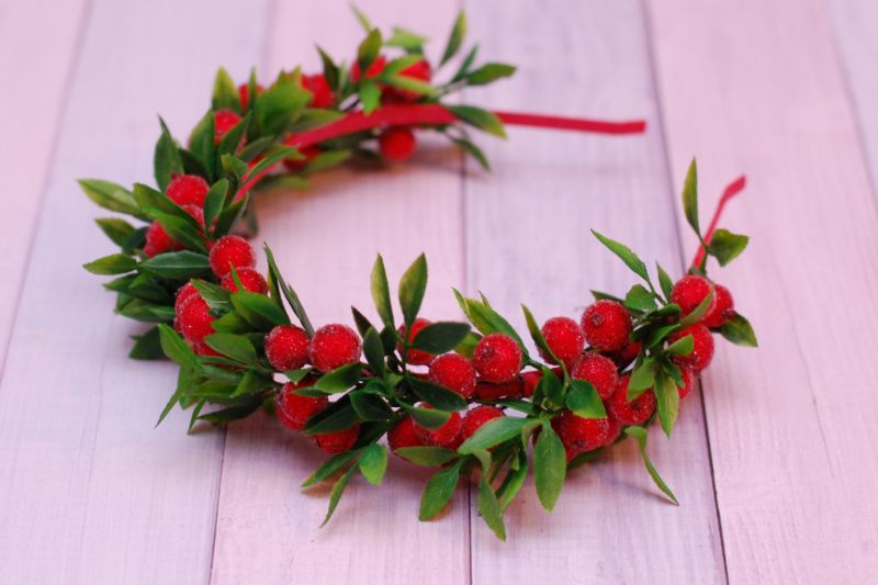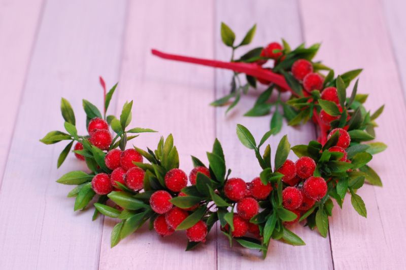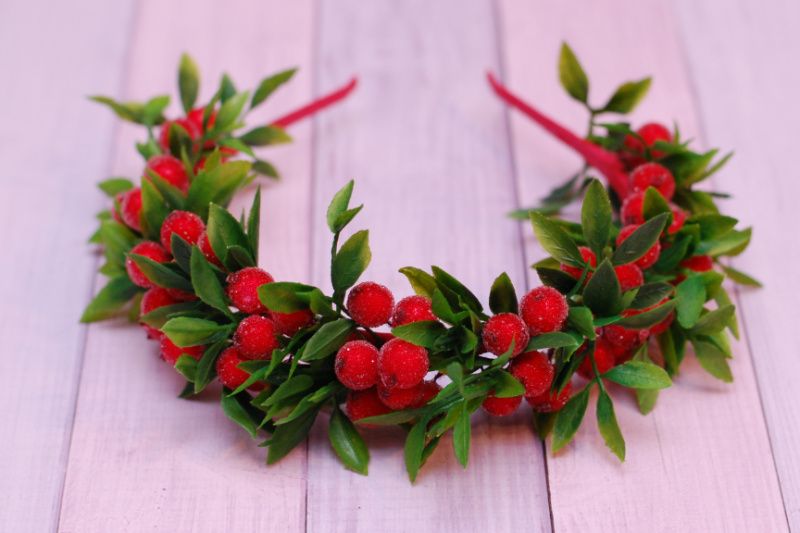 Обідок з ягодами калини та зеленню чудово доповнить образ калини на ранку в дитячому садку чи школі. Також підійде під вишиванку