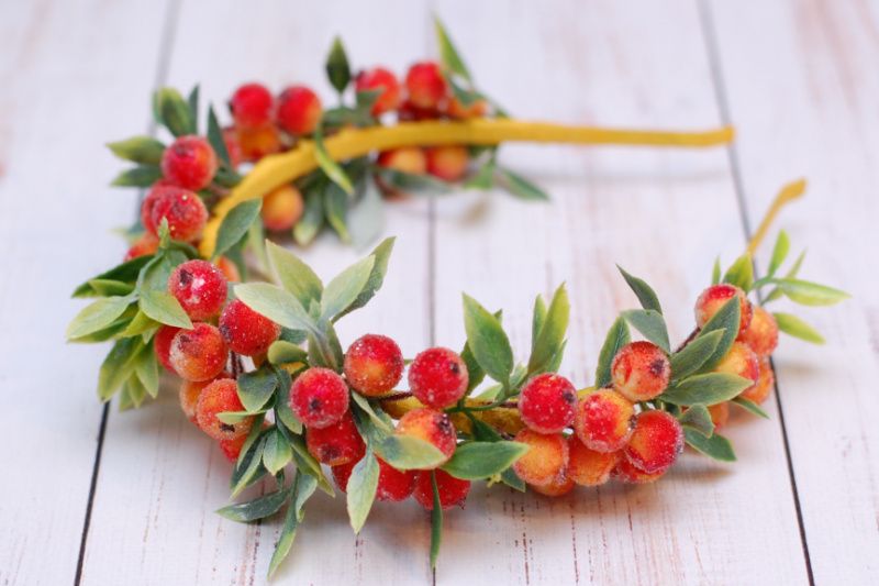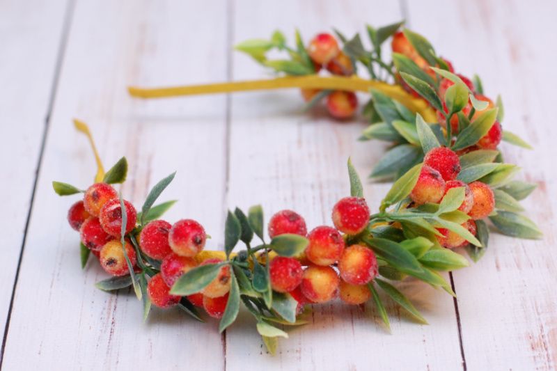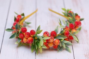 Ободок з ягодами горобини і зеленню прекрасно доповнить образ горобини на ранку в дитячому садку чи школі. Основа - металевий обруч універсального розміру, підійде як на дитину, так і на дорослого. Чи не тисне, але при цьому досить надійно тримається.