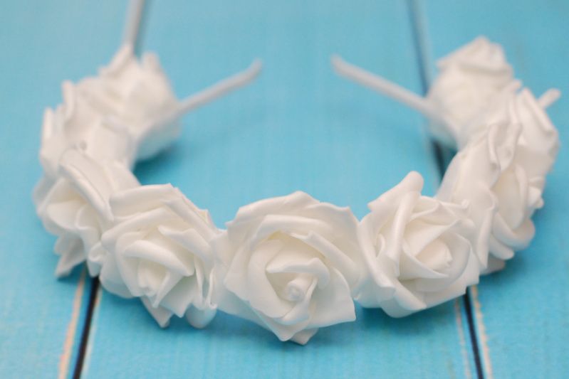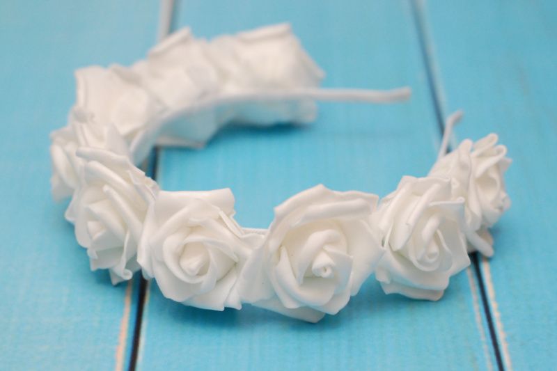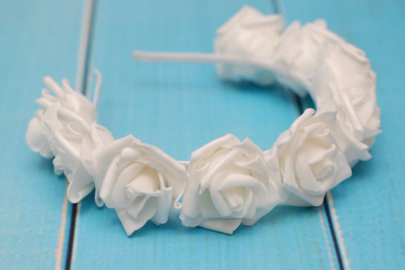 Обруч з білими трояндами доповнить Ваш святковий образ. Троянди із фоамірану, діаметр квіточки 5 см. Дуже легенький, ніжний і романтичний.