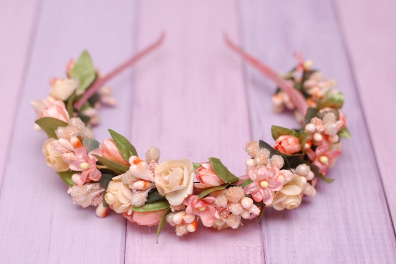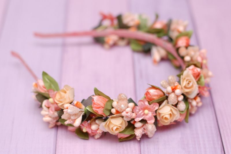 Ободок виконаний на металевій основі в персиковому кольорі. Дуже ніжний, підійде під будь-який наряд. Доповнить образ як для фотосесії, торжества, так і для повсякденного носіння.