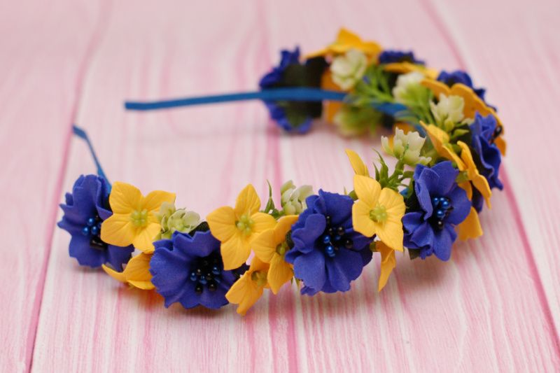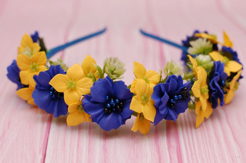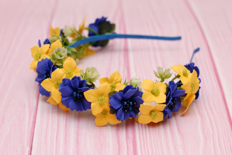 Нарядний, пишний обруч із штучних квітів виконаний в жовто-синіх кольорах. Квіти із фоамірана, ручна робота. Обруч ідеально буде пасувати до вишиванки. Можна вдягнути на весілля, національне свято. Підходить і дорослим, і діткам