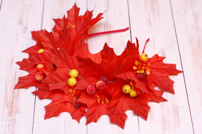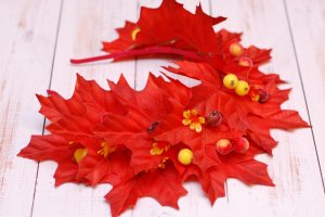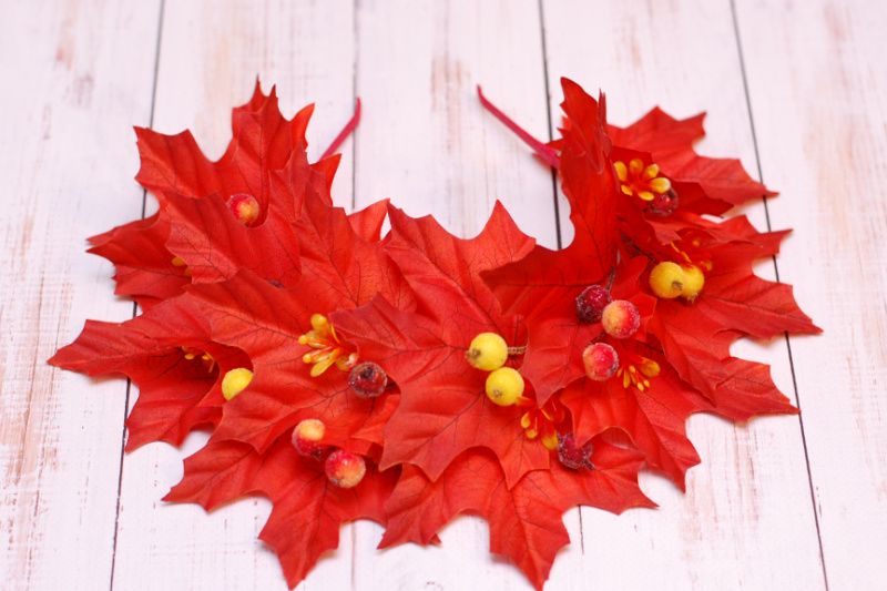 Яскравий осінній ободок для волосся підійде для тематичних заходів, концертних виступів, дитячого ранку в садку або школі. Ободок декорований листям і ягідками. Всі елементи надійно закріплені на металевому обідку універсального розміру.