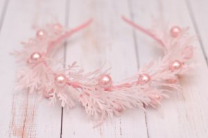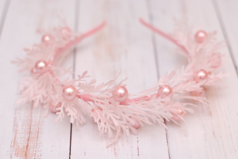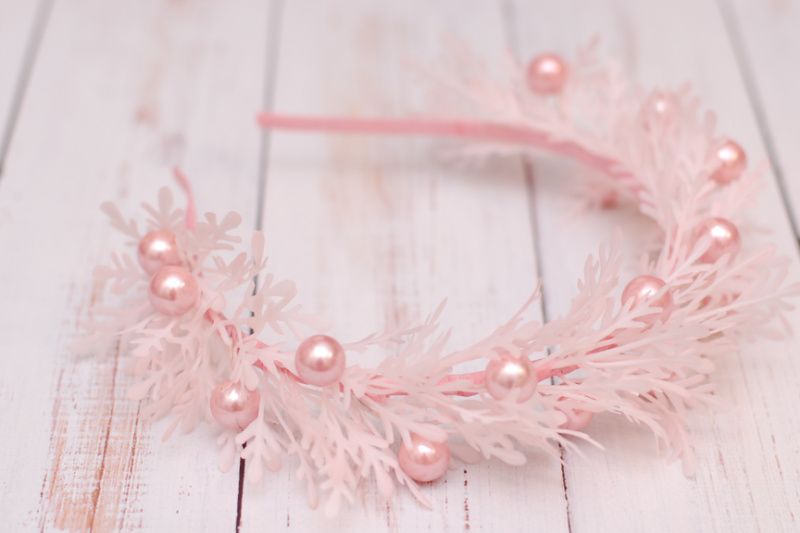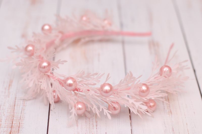Ніжний обідок виконаний у пудровому кольорі. Декорований гілочками та ягідками. Доповнить святковий образ
