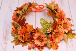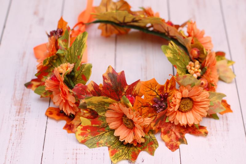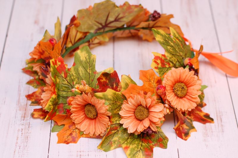 Осінній вінок виконаний з листя клена і квітів. Яскрава прикраса для осінньої фотосесії, свята осені в дитячому садку і школі, концертної та театральної діяльності. Вінок легкій.Окружность віночка 50 см, розмір регулюється стрічкою. Всі деталі вироби надійно закріплені на дротовому каркасі.