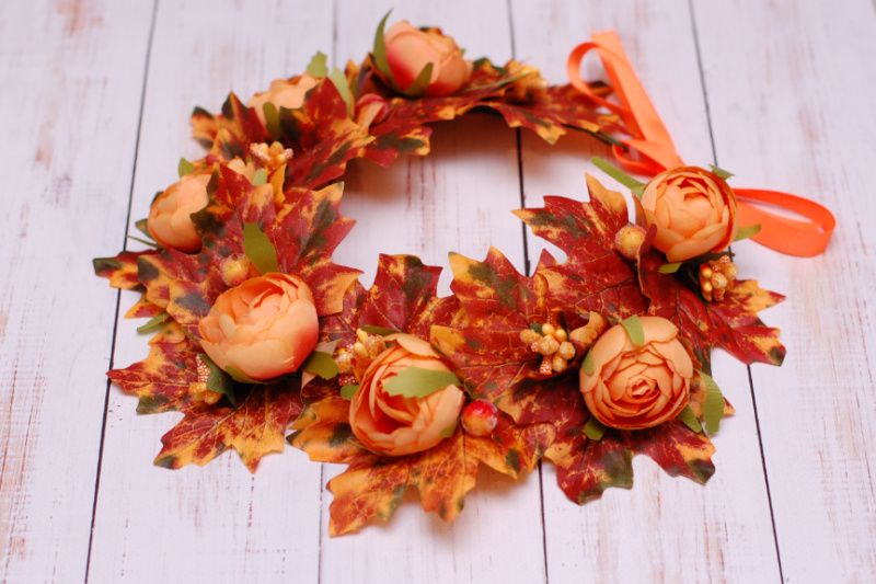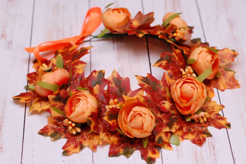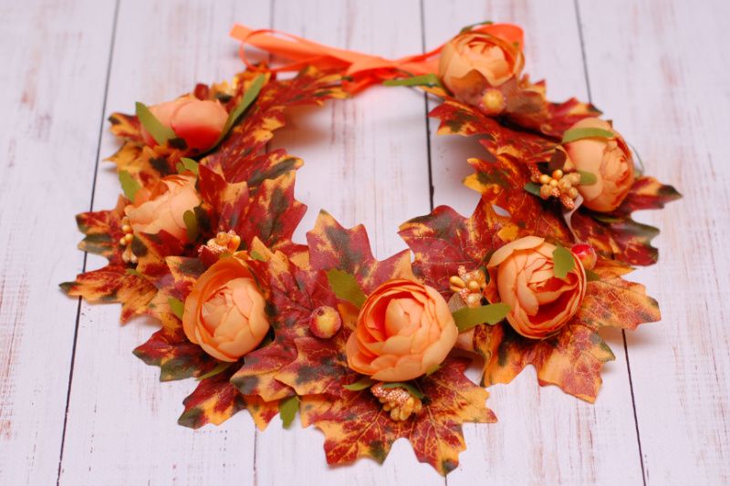 Осінній вінок виконаний з листя клена і квітів. Яскрава прикраса для осінньої фотосесії, свята осені в дитячому садку і школі, концертної та театральної діяльності. Вінок легкій.Окружность віночка 50 см, розмір регулюється стрічкою. Всі деталі вироби надійно закріплені на дротовому каркасі.