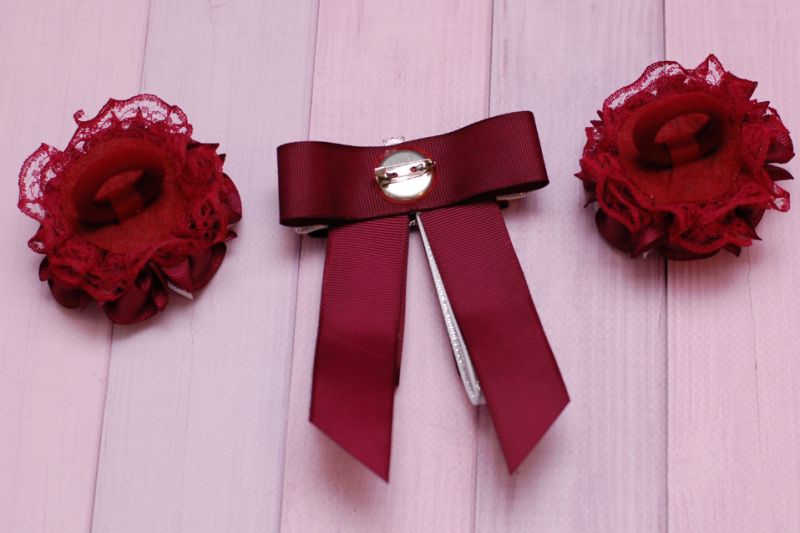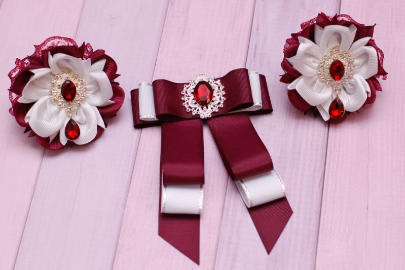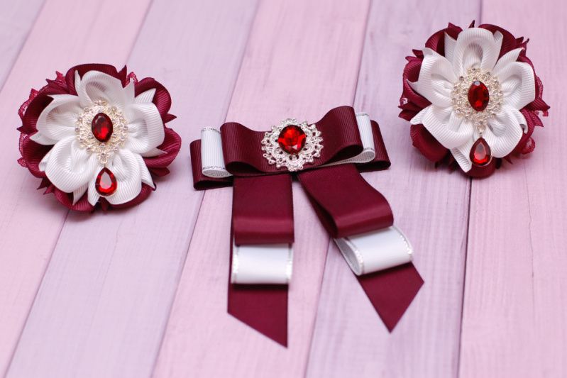 Ошатний комплект складається з бантів (основа - гумки) і краватки. Виконано в біло-бордовому кольорі з якісних репсових стрічок, мережива, декорований красивою стразового серединкою. Виглядає дуже ефектно, підійде як першокласникам, так і дівчаткам постарше. Розміри бантиків в діаметрі 7 см Краватка - 9 * 13 см