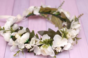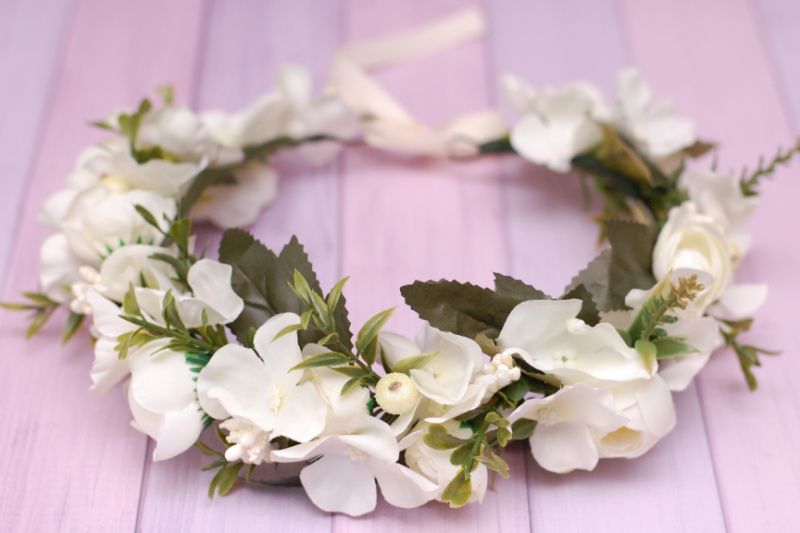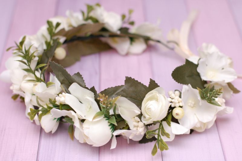 Об'ємний віночок з трояндами і гортензією виконаний в кремовому кольорі. Квіти із тканини, віночок легкий. Ідеальний для фотосесій, святкових і весільних образів. Модний і стильний. Розмір регулюється стрічкою