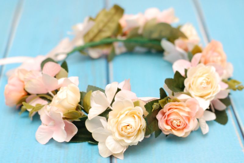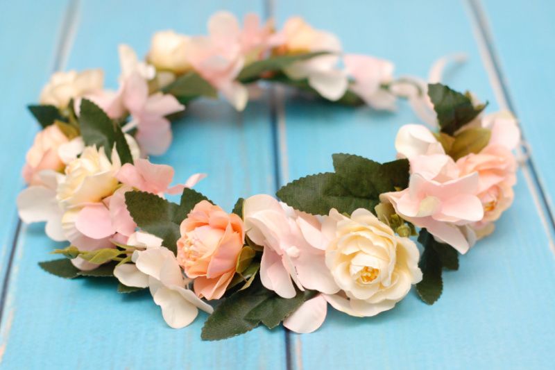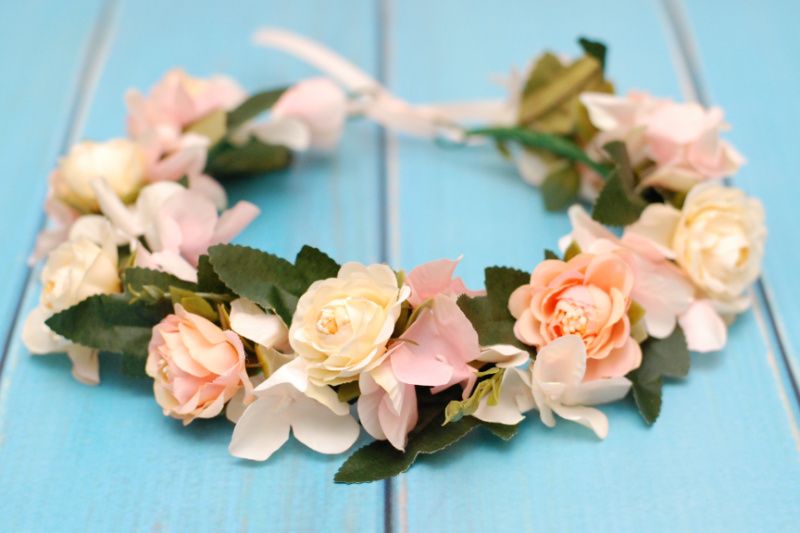 Об*ємний віночок з квітами виконаний у кремово-персиковому кольорі. Квіти тканеві. Композиція доповнена гілочками зелені та листочками. Розмір універсальний, регулюється стрічкою.