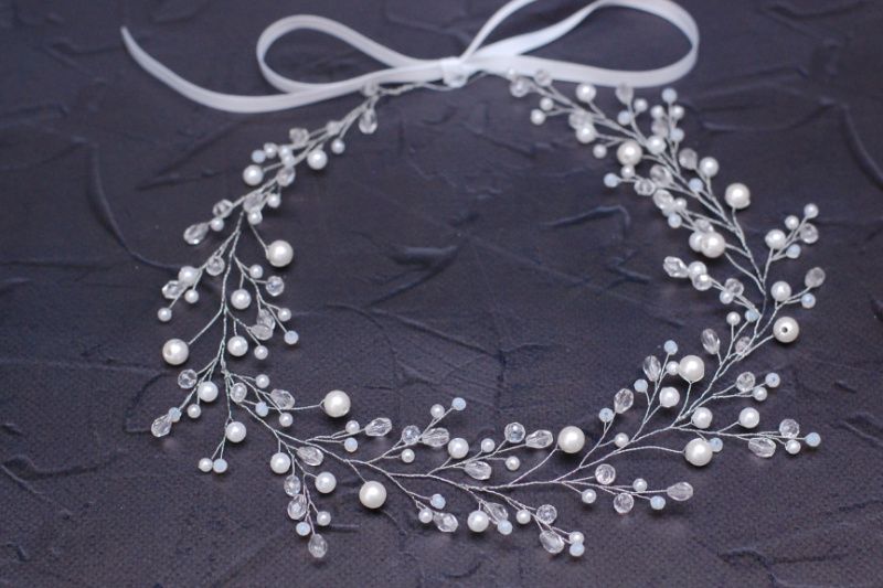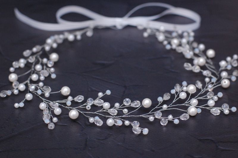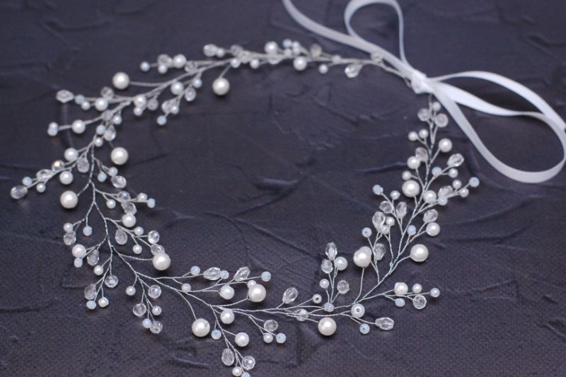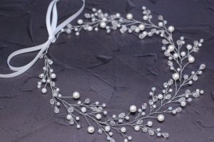 Вінок для весільної зачіски виконаний з білих та прозорих намистин різних форм та розмірів. Виконаний на ювелірному дроті сріблястого кольору. Довжина вінка близько 50 см, розмір регулюється стрічкою. Цей вінок можна злегка згинати формою зачіски, можна зав'язати стрічкою, а можна сховати кінчики в зачіску і закріпити невидимками. Дуже ошатний, романтичний; буде виглядати і з локонами, і з гладкими пасмами