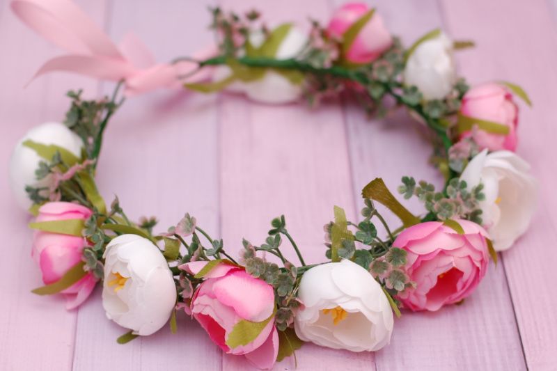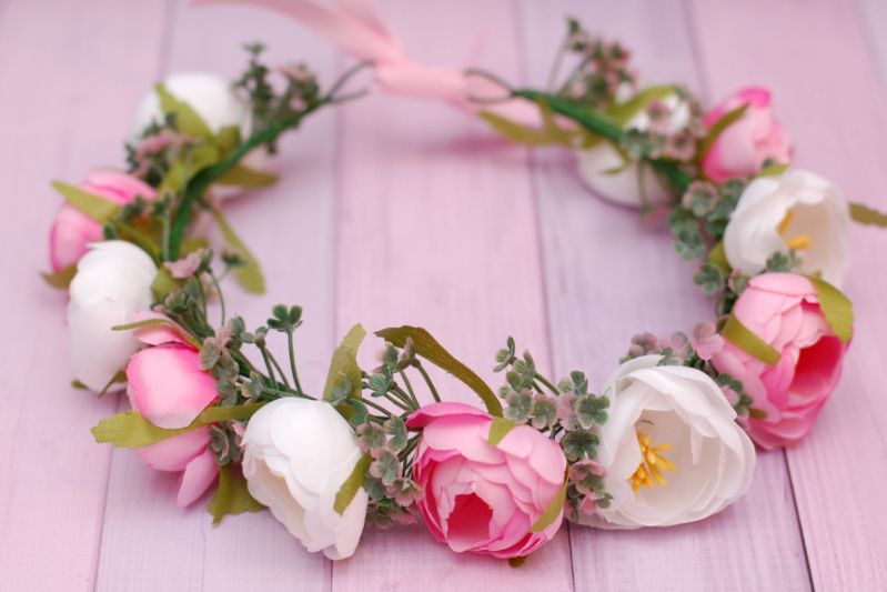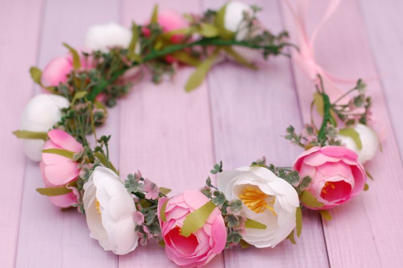 Ніжний віночок з півоніями виконаний в біло-рожевому кольорі, декорований гілочками зелені. Квіти із тканини, діаметр близько 4 см. Ідеальний варіант для фотосесій, святкових образів. Модний і стильний. Розмір регулюється стрічкою