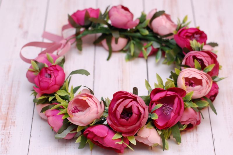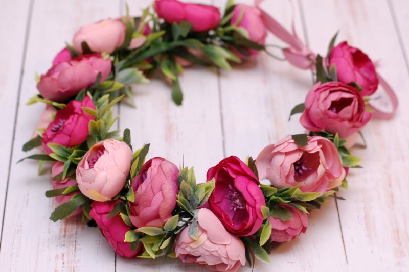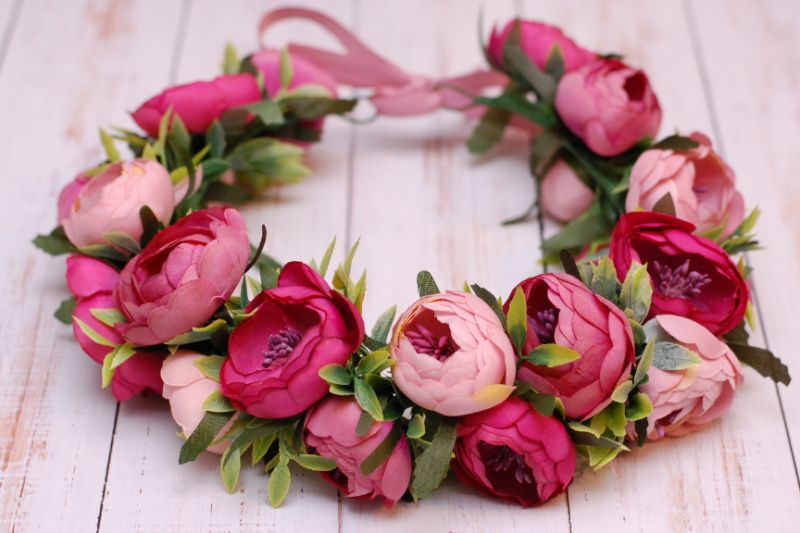 Об'ємний віночок з півоніями виконаний в пудровий-марсаловом кольорі. Квіти із тканини, діаметр близько 4 см. Ідеальний для фотосесій, святкових образів. Модний і стильний. Розмір регулюється стрічкою