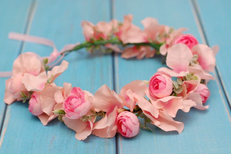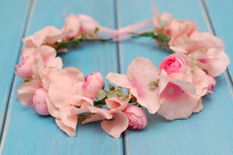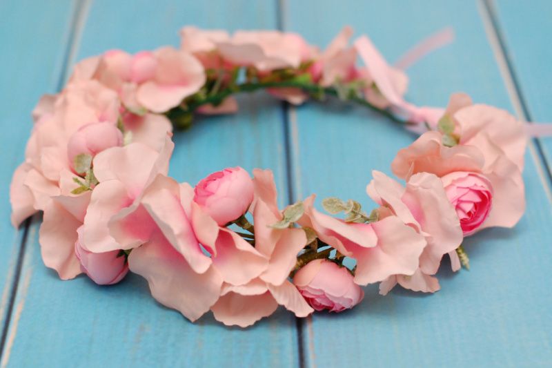 Об*ємний віночок з ранункулюсами і гортензією виконаний у рожевому кольорі. Квіти тканеві. Композиція доповнена гілочками зелені. Легкий, пишний і святковий. Розмір універсальний, регулюється стрічкою.
