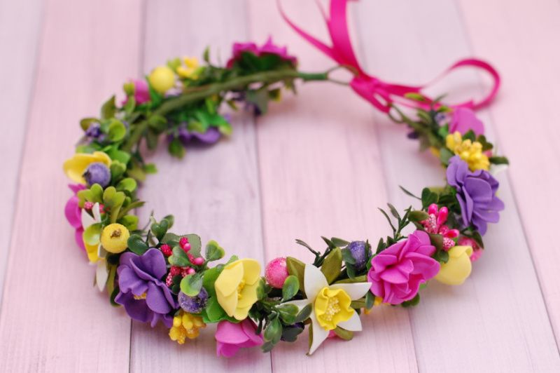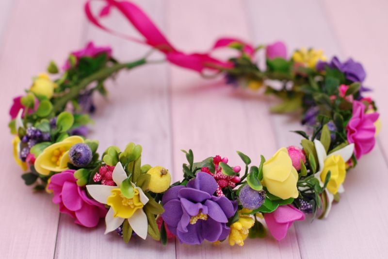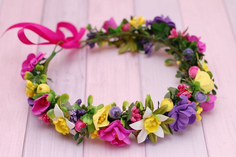 Яскравий віночок виконаний в жовто-малиново-фіолетових кольорах. В роботі використані квіти ручної роботи з фоамірана: дзвіночки, нарциси, фіалки. По-справжньому весняний і яскравий! Підійде для весняних фотосесій або ролі весни на святі. Віночок на дротяної основі, універсальний розмір.