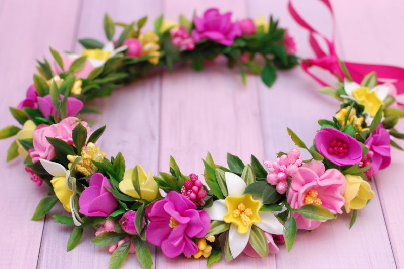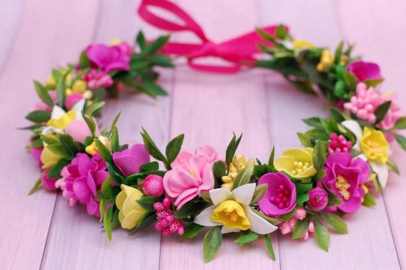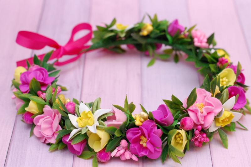 Весняний віночок виконаний у яскравих кольорах: жовтому, рожевому та малиновому. У роботі використані квіти ручної роботи із фоамірану: дзвіночки, нарциси, фіалки. По-справжньому весняний та яскравий! Підійде для весняних фотосесій чи ролі весни на ранку. Віночок на дротяній основі, універсальний розмір.