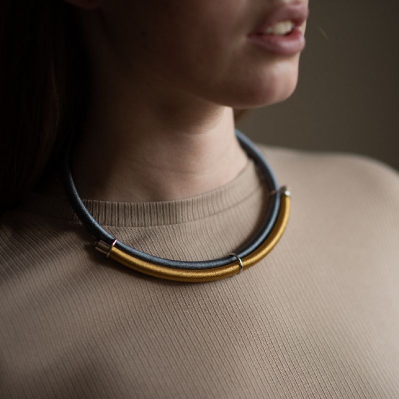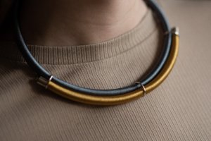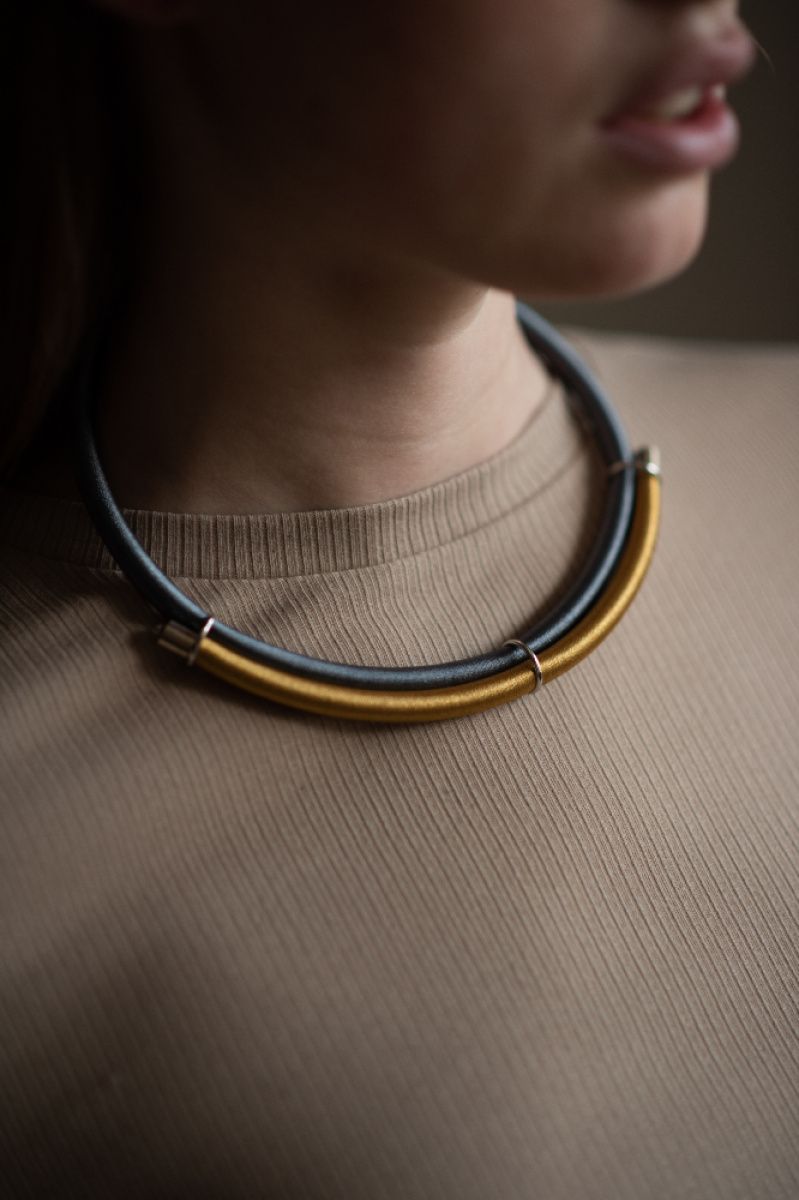 Прикраса в золоті із темним сріблом стане універсальним аксесуаром для багатьох варіантів одягу. Посадка регулюється застібкою.