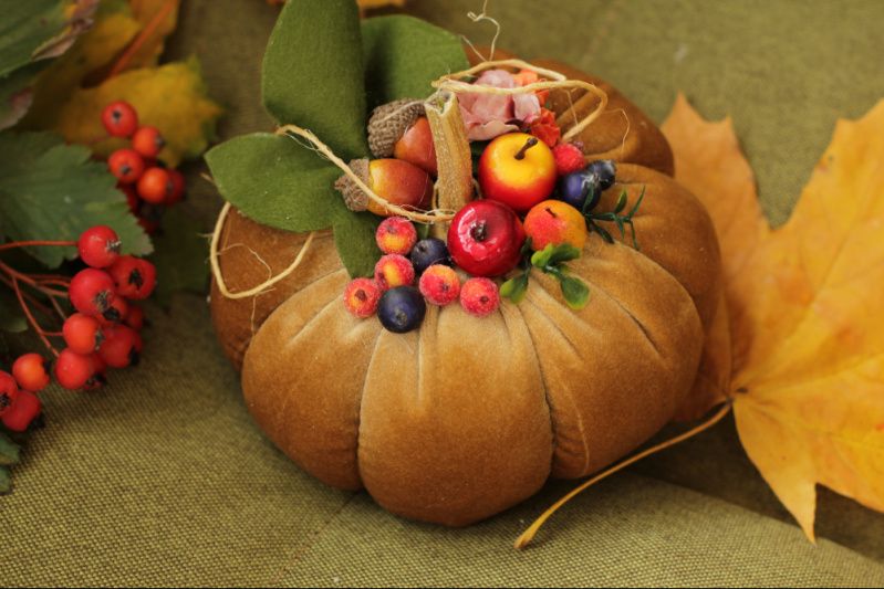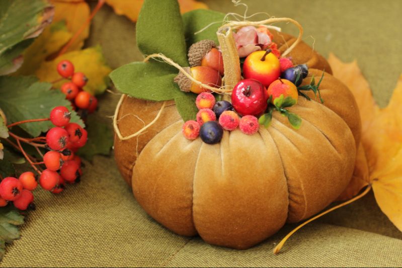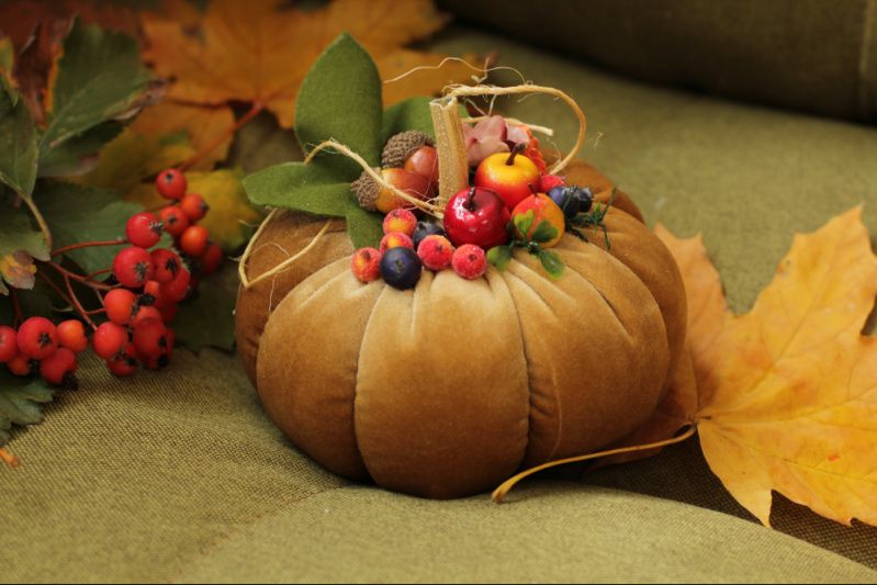 Текстильная бархатная тыква с декором для создания осеннего уютного настроения