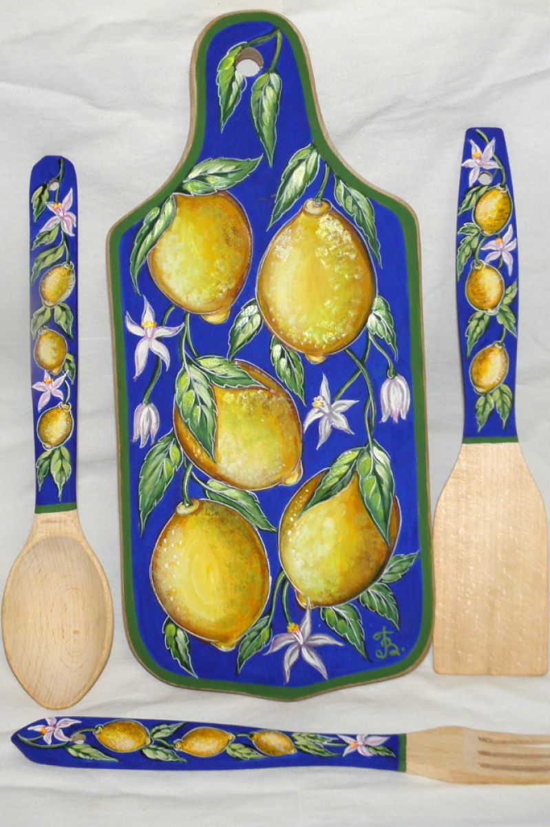 Набір для кухни- Дошка, ложка, лопатка, вилка. Дерево бук, розпис гуашшю, покрите лаком алкіду.