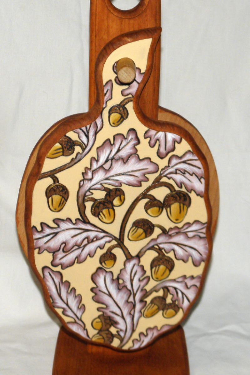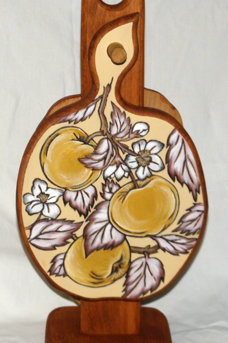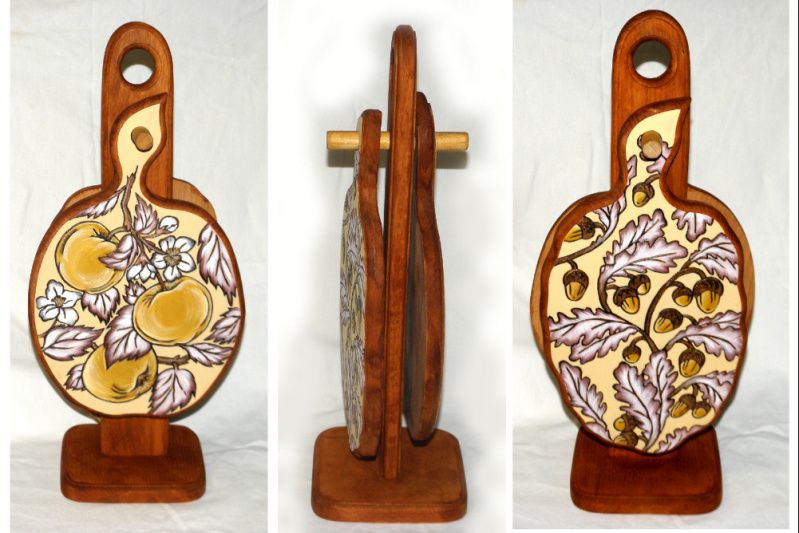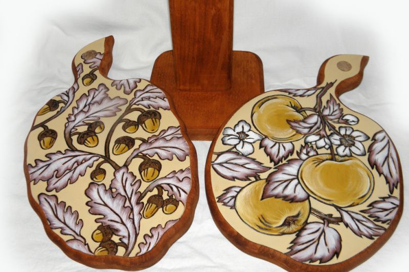 Кухонний набір з 2х дощок ЯБЛУЧКО і ДУБОВИЙ ЛИСТ на зручній підставці. Виконано в техніці випалювання по дереву і розпису.