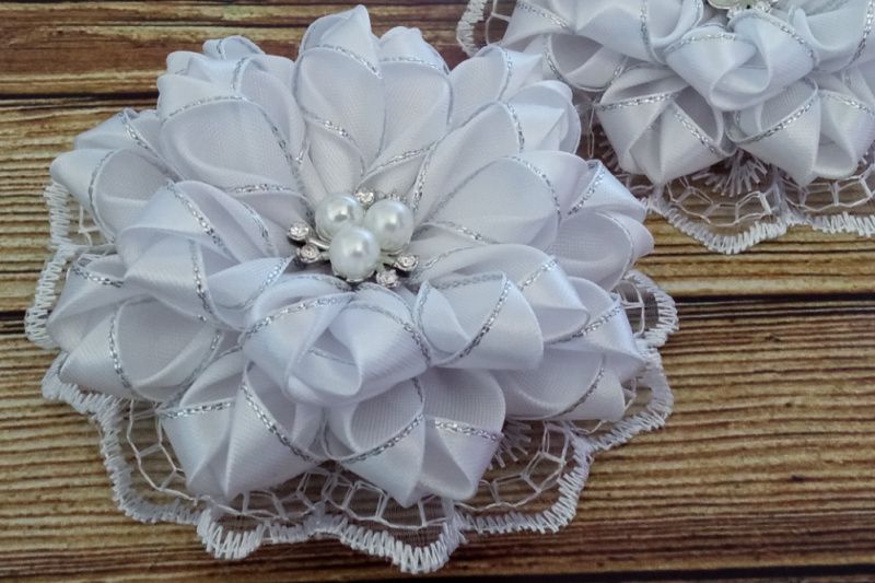 Нарядні білі бантики з атласної стрічки з люрексом та мережива. Підійдуть на випускний або на 1 вересня