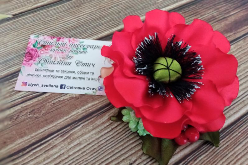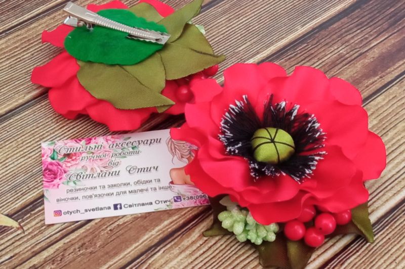 Пишні маки з атласної стрічки з додаванням штучних ягід калини та квіткових додатків. На заколці. Ціна за 1шт