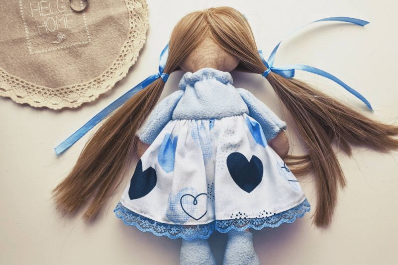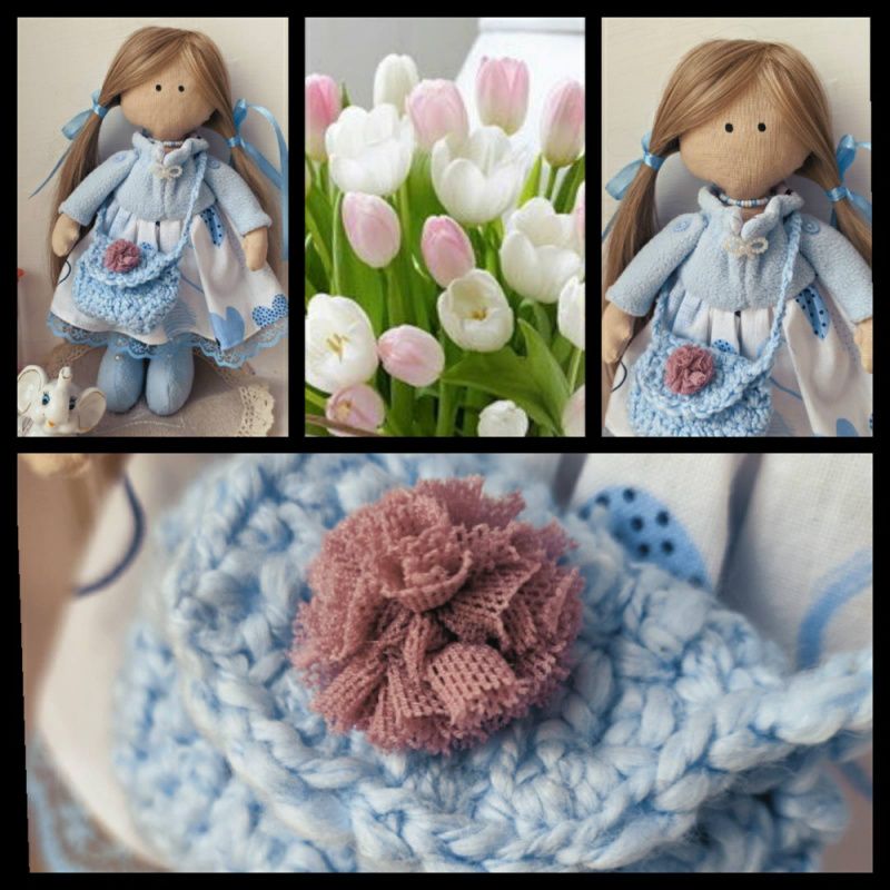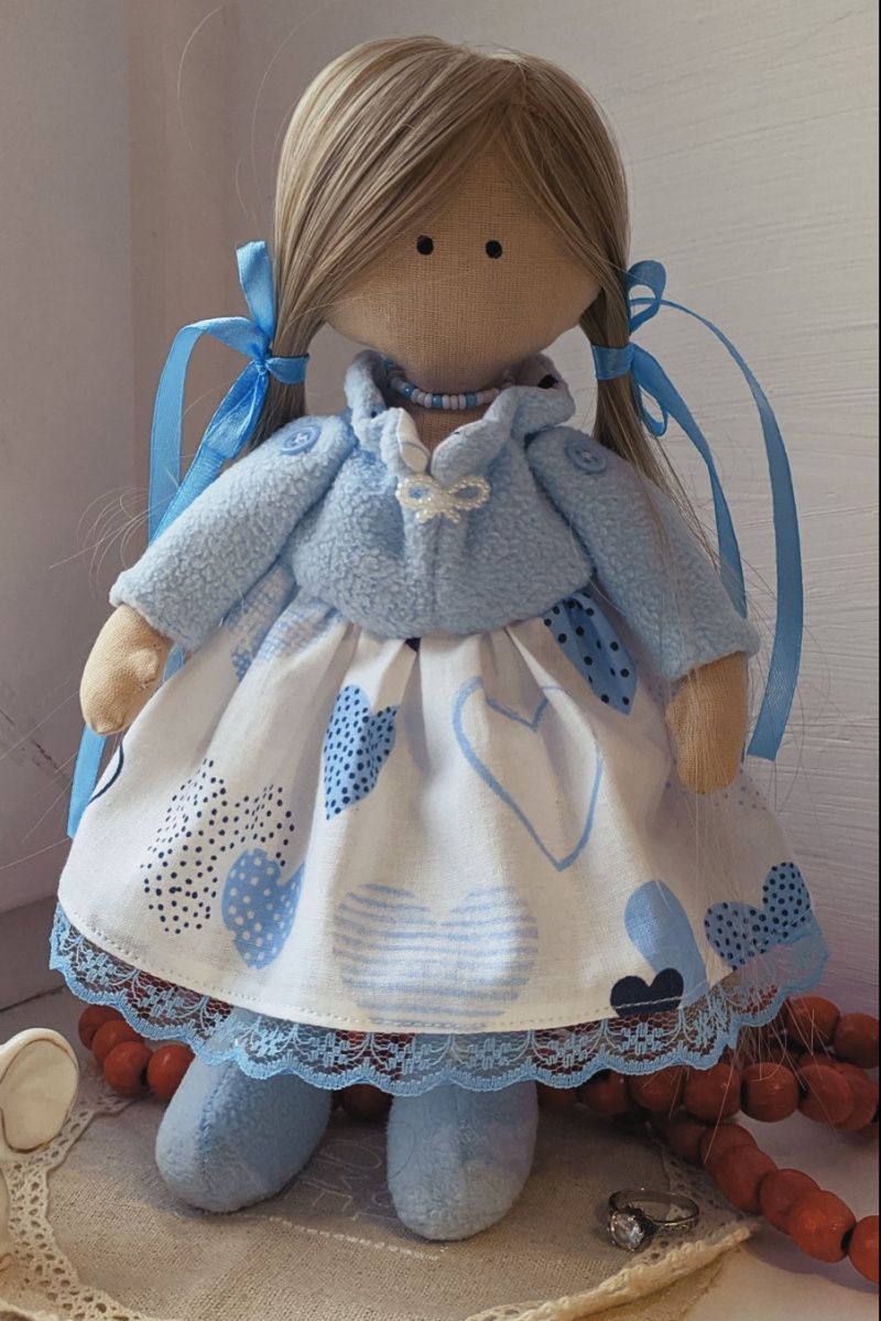 Лялька ручної роботи. Виконана з натуральних матеріалів. Одяг не знімається. Блакитна сумочка. Волосся - штучні Треси.