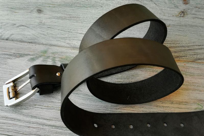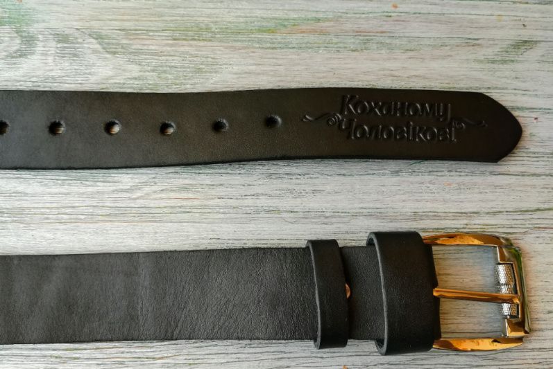 Ремень изготовлен из ременной кожи шириной 3,8 см, длиной 122 см, черного цвета с серебристой пряжкой, украшен оригинальным тиснением. Он не склеен и не сшит, а изготовлен из цельного куска высококачественной натуральной кожи. Длина ремня просто регулируется самостоятельно под Ваш размер.