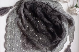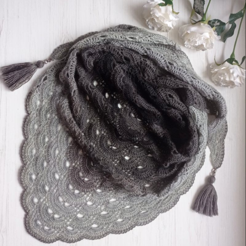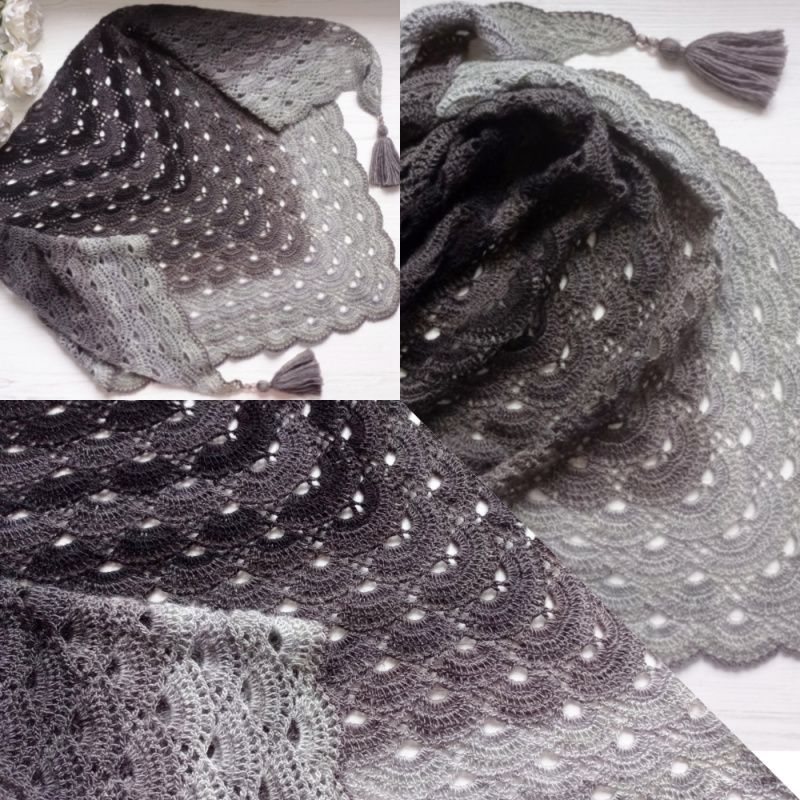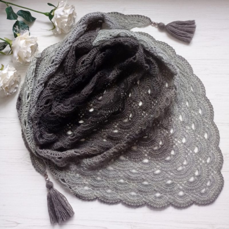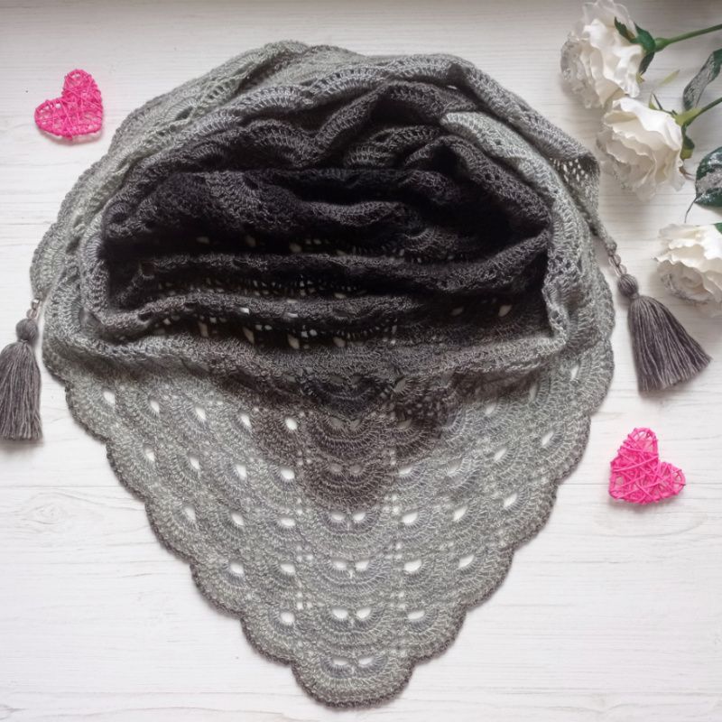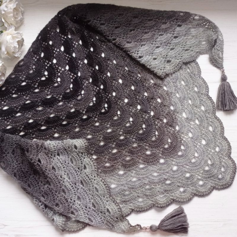 Вишуканий, стильний бактус з красивим візерунком, пов'язаний гачком. Колір градієнт темного сірого і його відтінків. Бактус пов'язаний з ніжною пряжі, в складі якої шерсть альпаки і преміум акрил. Гіпоалергенний, м'який, ніжний, зовсім не колючий, дуже затишний. Бактус легкий, вага близько 200 гр, добре драпірується. Вироби ручної роботи це найкращий подарунок для коханої дівчини, жінки, мами, так як він ексклюзиву і неповторний. Розмір бактус 165 * 70 см без урахування пензликів. НАЯВНІСТЬ. Встигніть придбати оригінальний подарунок для улюблених до 8 Березня.
