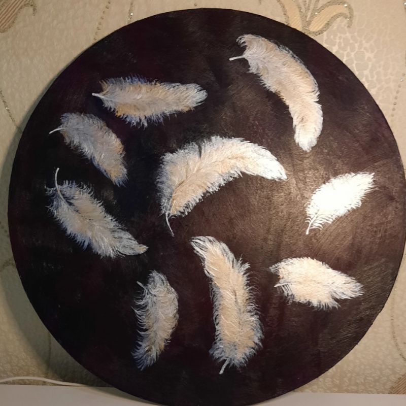 ДВП, акрил, перламутрові з золотим пір'ячко, в єдиному екземплярі., Ідея мастера.Діаметр 38 см.Не таке яскраве як на фото.Для інтер'єру без рамки.