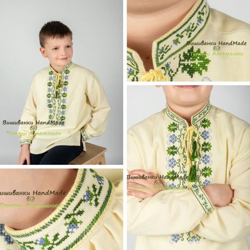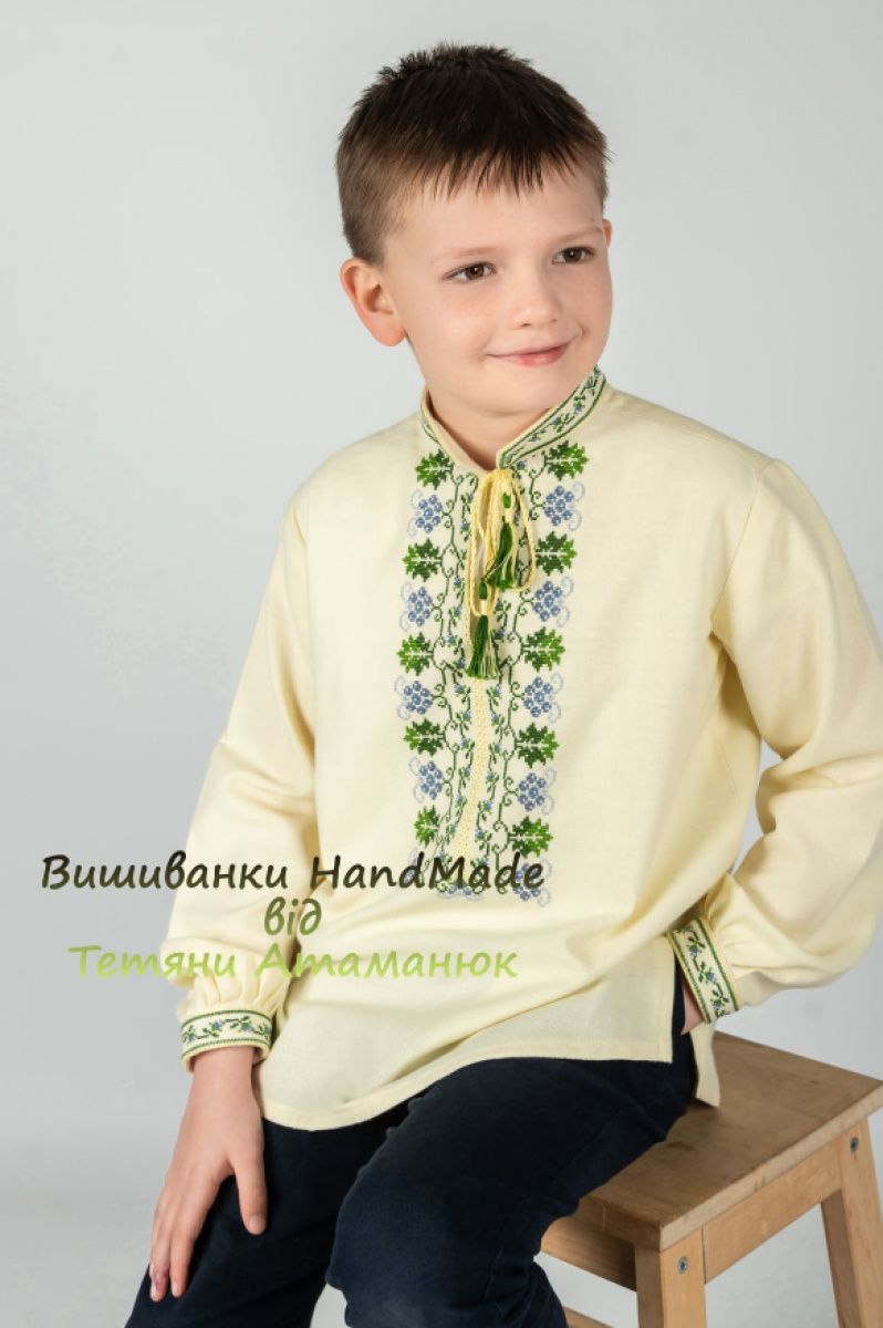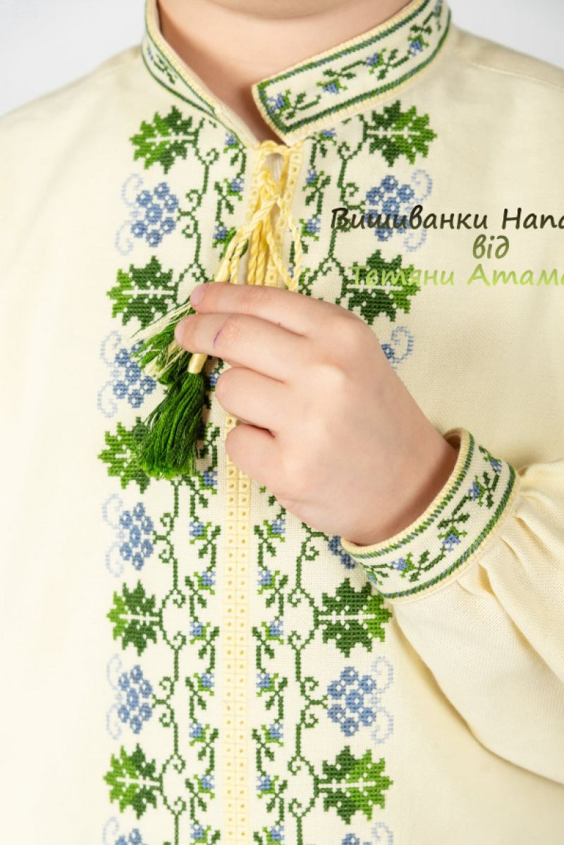 Теплий колір тканини та ниток, необтяжливий орнамент із елементами винограду, який входить у першість символів українських вишиванок, сподобається маленькому власнику.