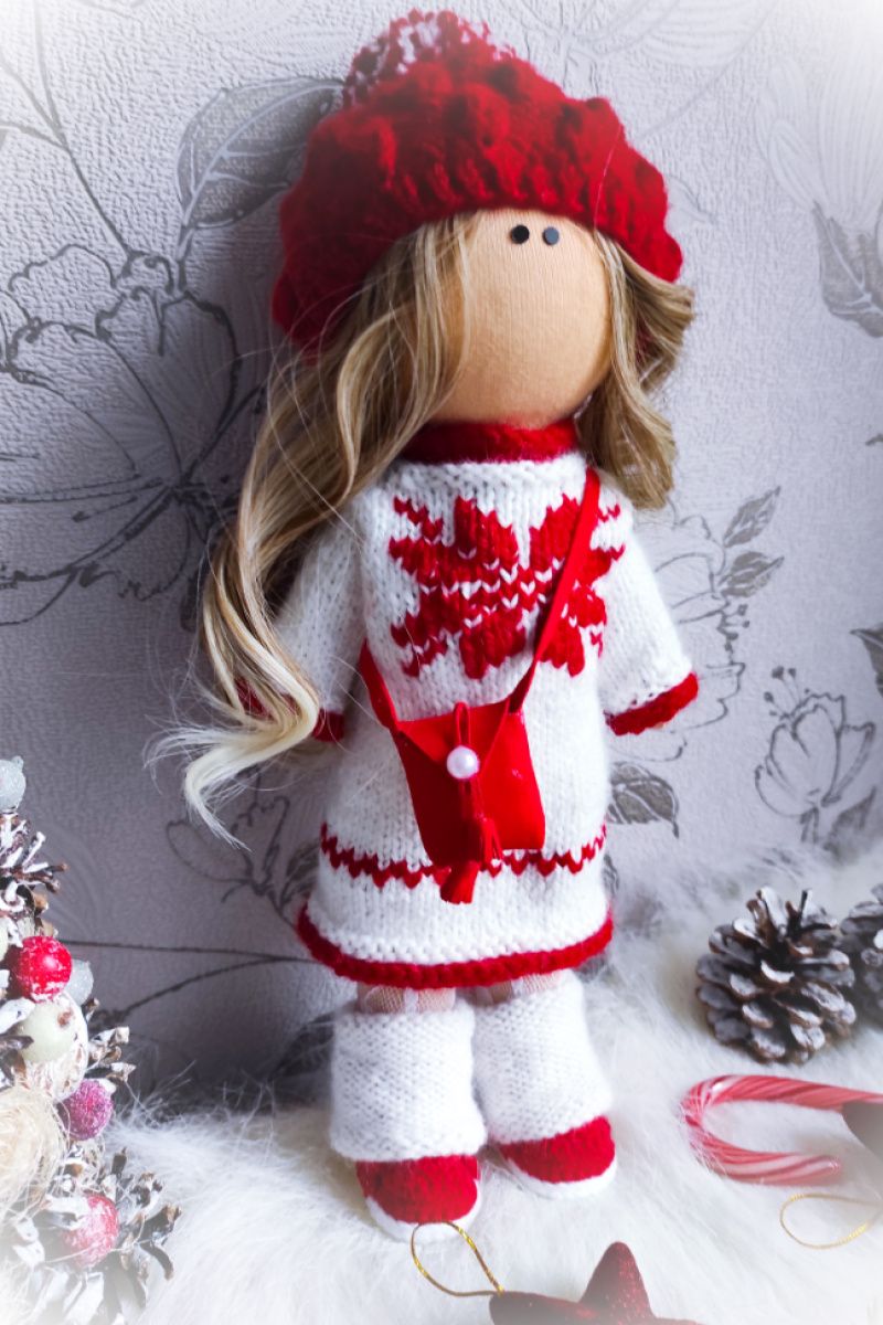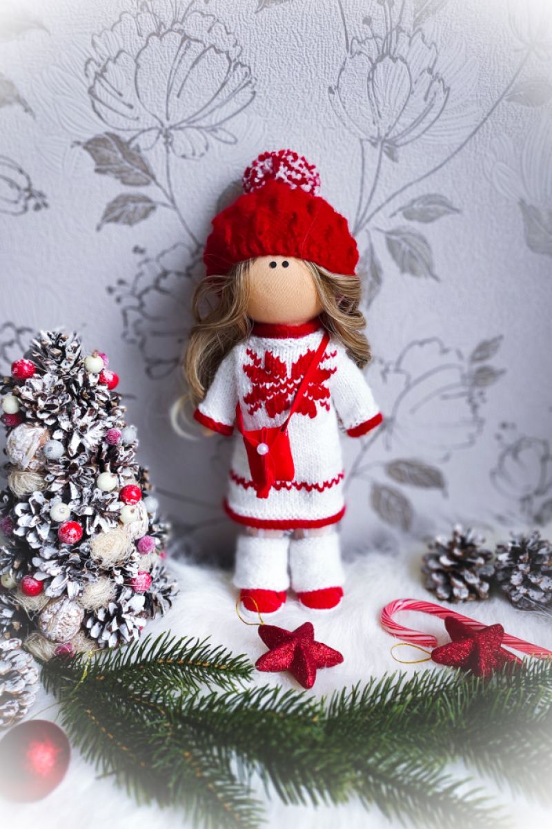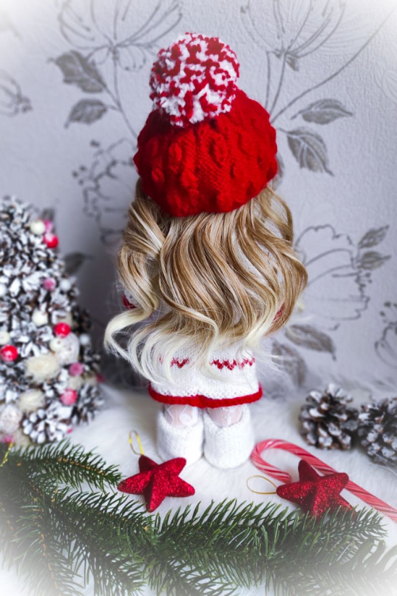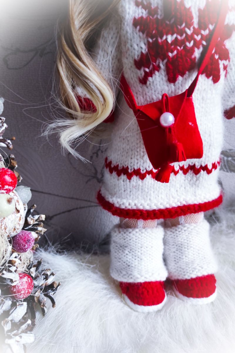 Лялечка одягнена у в'язану білу сукню,яка оздоблена червоним зимовим орнаментом))